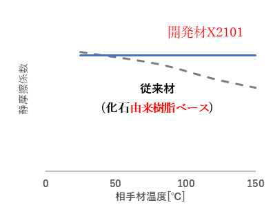 カーボンニュートラル実現に貢献できる点も注目されている。この開発材X2101は、ブレーキ用摩擦材の課題である高温域での性能を安定させた。25℃~150℃の静摩擦性能変化をほぼゼロとし、耐久性能を示す耐摩耗特性は従来材(化石由来樹脂ベース)の2倍にアップ(グラフ1)。