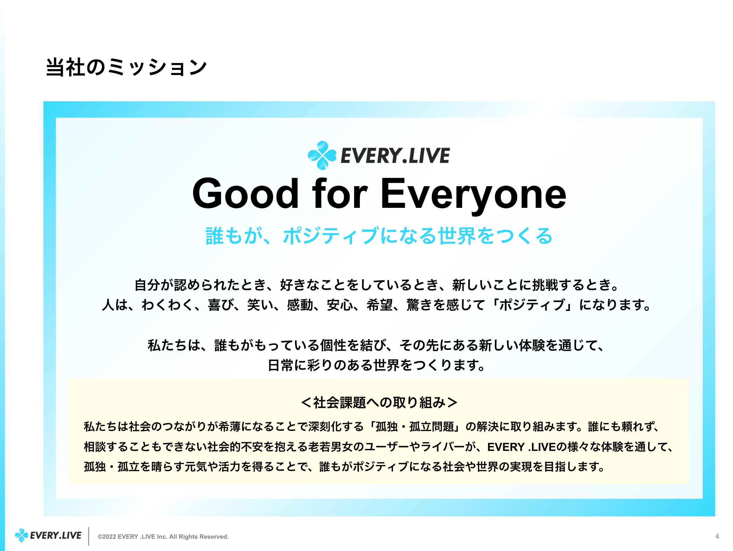 「EVERY .LIVE」は、”Good for Everyone”をミッションに掲げ、誰もがポジティブになる社会や世界の実現を目指しています。