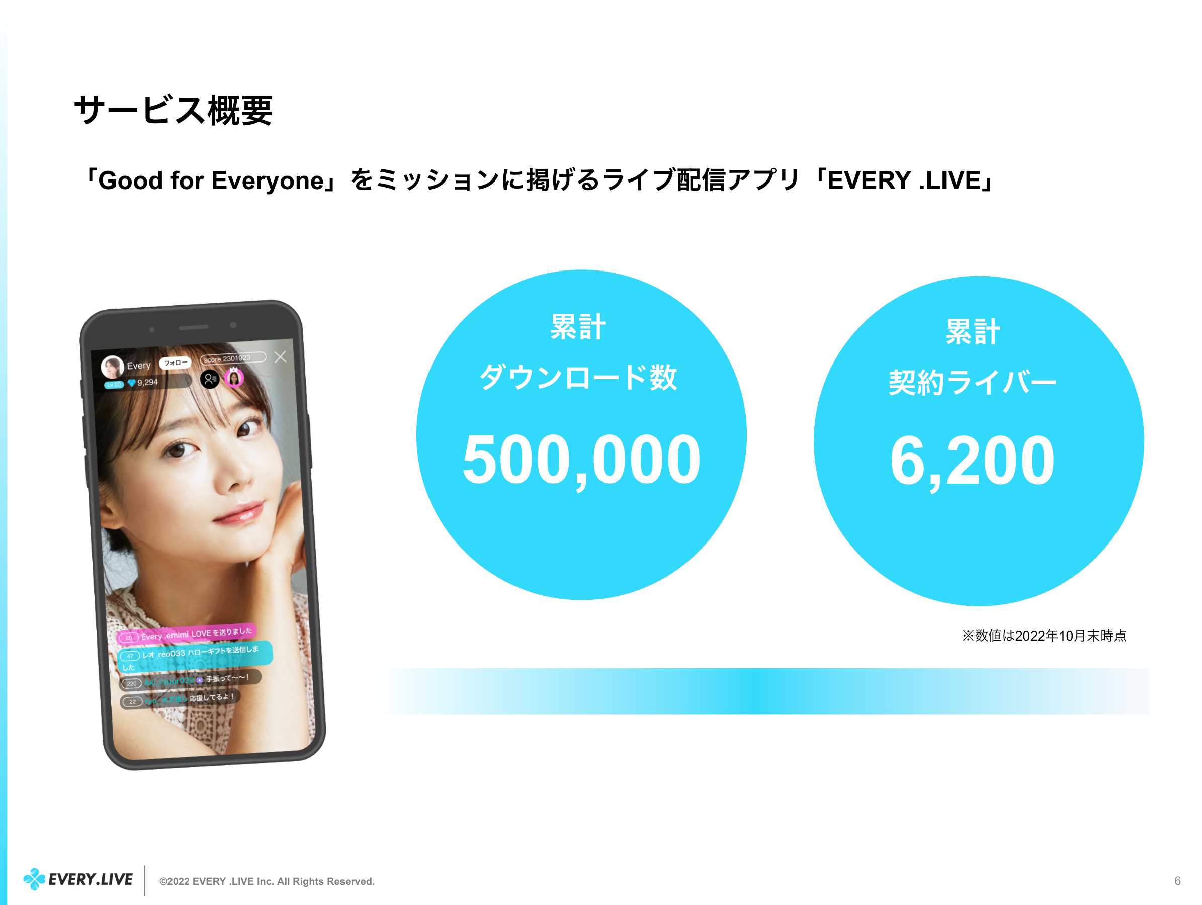 「Good for Everyone 〜誰もがポジティブになる世界をつくる〜」をミッションに掲げる「EVERY .LIVE(エブリィライブ)」は、累計ダウンロード数50万、売上高10億円(2022年10月時点)を突破している急成長中のライブ配信アプリです。人がポジティブになる「わくわく」「喜び」「笑い」「感動」「安心」「希望」「驚き」を体感できる機能やイベント、環境を提供していきます。