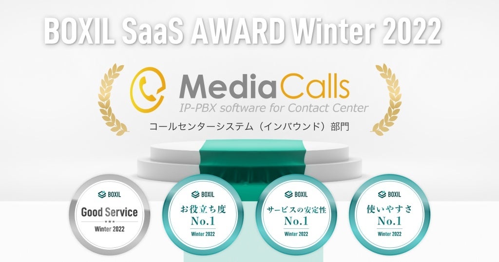 今回の「BOXIL SaaS AWARD Winter 2022」は、2021年10月1日から2022年9月30日までの1年間で新たに投稿された口コミ約10,000件を審査対象としており、「MediaCalls」は「コールセンターシステム(インバウンド)部門」で「Good Service」「お役立ち度 No.1」「サービスの安定性 No.1」「使いやすさ No.1」に選ばれました。