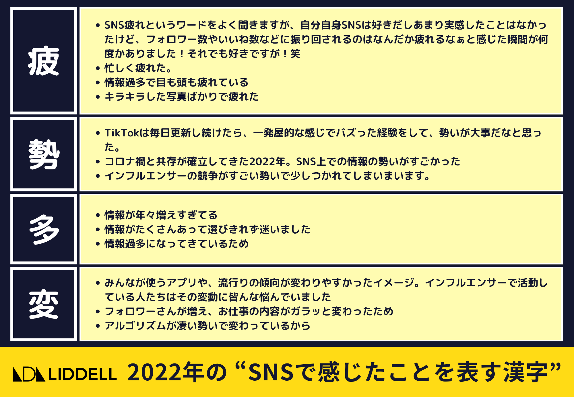 2022年は、日経MJヒット商品番付で「3年ぶり」が西の横綱となったように、コロナ禍前のような日常が戻りつつありました。SNSでは、アルゴリズムの大幅な変化により、コミュニケーションの重要度が向上。(参考:https://service.liddell.tokyo/notice/1239/)また、TikTokやInstagramのリール、YouTubeショートなどの短い動画が注目されるとともに、画像にテキストがあしらわれた文字入れ投稿が主流となりました。
