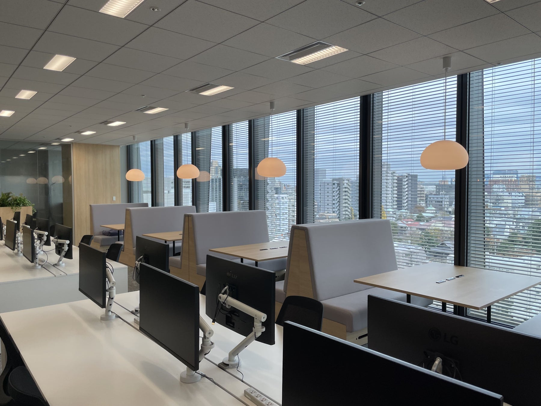 圧迫感を軽減し、責任者との距離を縮める効果を期待し、全席フリーアドレスにしました。アーム付きのモニターを配置したテーブル38席とカウンター10席、集中業務に対応するためのパーテーションブース3席、さらにオンラインミーティング対応したWEBブース3部屋を用意し、業務の目的にあった席を選択できるようにしています。