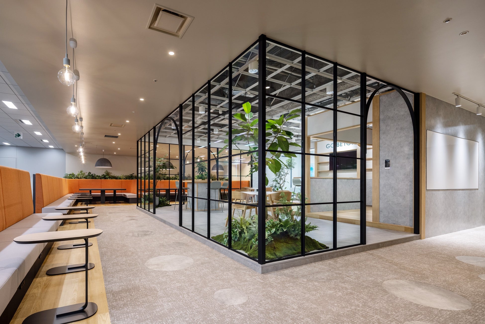 間接部門は座席で仕事をすることが多いため、「ON」の時間を充実させるための執務エリアと「OFF」に時間をしっかりリフレッシュできる中庭エリアに区分しました。