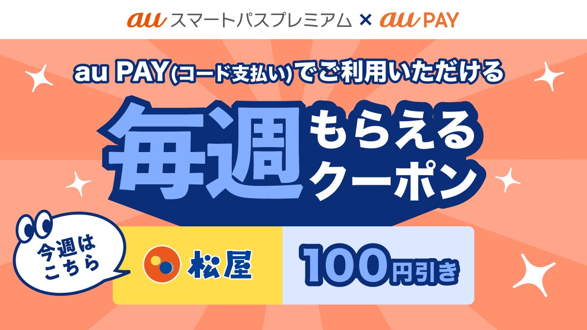 | 概要 | 全国の松屋フーズにおいて、au PAYで101円以上のお食事に使える100円割引クーポンをプレゼントします。 ※期間中、クーポンの取得は1au IDあたり1回限りです。 適用条件や利用方法などの詳細はこちら(http://kddi-l.jp/zTo)をご参照ください。 |