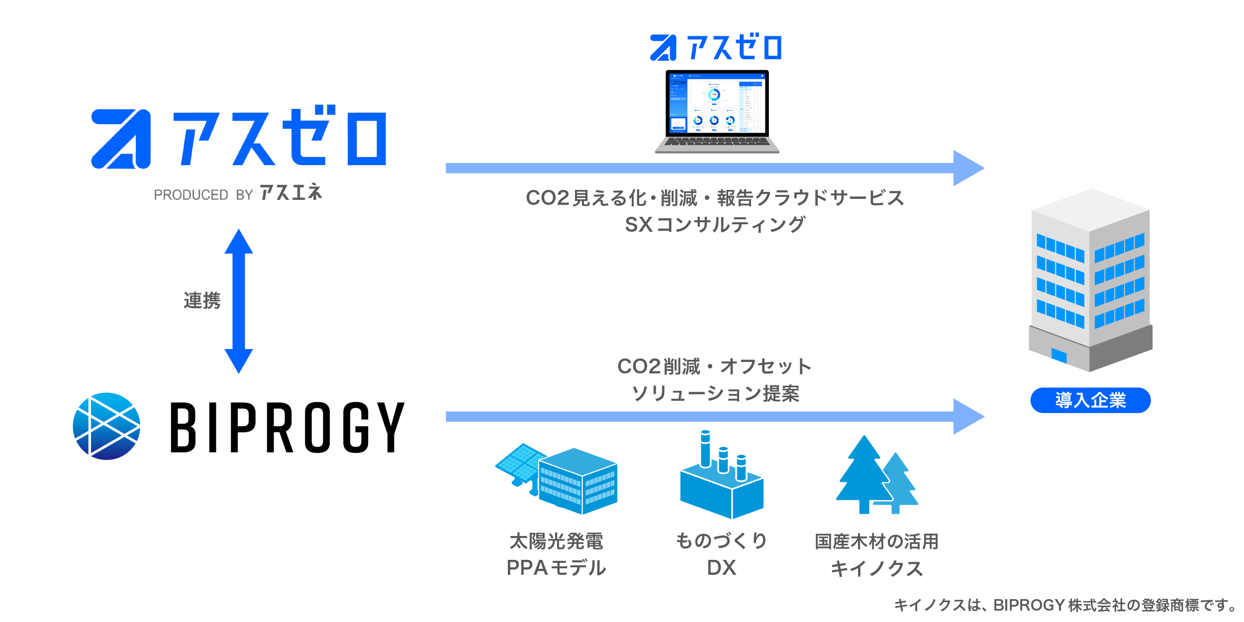 BIPROGYは、企業向けにDX推進に向けた多様なITソリューションを提供しています。今回の業務提携では、当社の「アスゼロ」とBIPROGYの脱炭素ソリューションの組み合わせにより、企業のカーボンニュートラルをトータルで支援します。