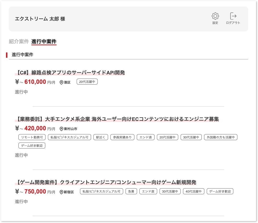 エクストリームフリーランスからご紹介した案件が一覧で確認できる画面です。