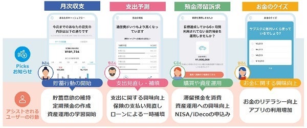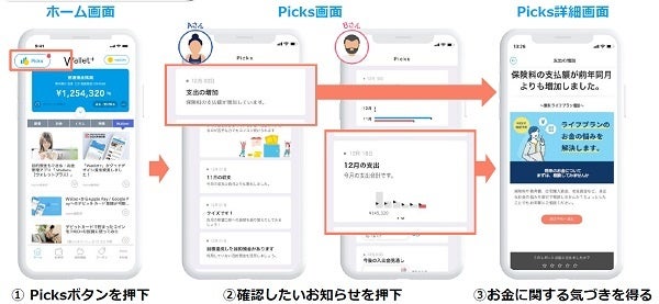 Picks機能は、 iBank社で蓄積している多くの金融・非金融データに基づき、AIが最適なタイミングで有益な”お知らせ“をWallet+ユーザーにお届けすることで、日々の家計管理から将来を見据えたマネープランに至るまで、お客さまの豊かな人生設計のアシストをすることを目指します。