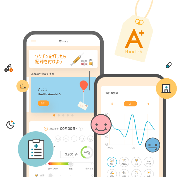 「Health Amulet(ヘルスアミュレット)」は、ワクチンの接種予約日・接種記録管理の他、健康管理アプリとしてさまざまな機能を利用できます。使い続けることで、健康を長く守ることができます。