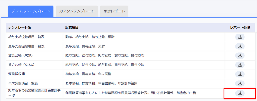 ▶給与所得における、源泉徴収票等の法定調書合計表を作成する際に、必要となる数値を出力することができます。