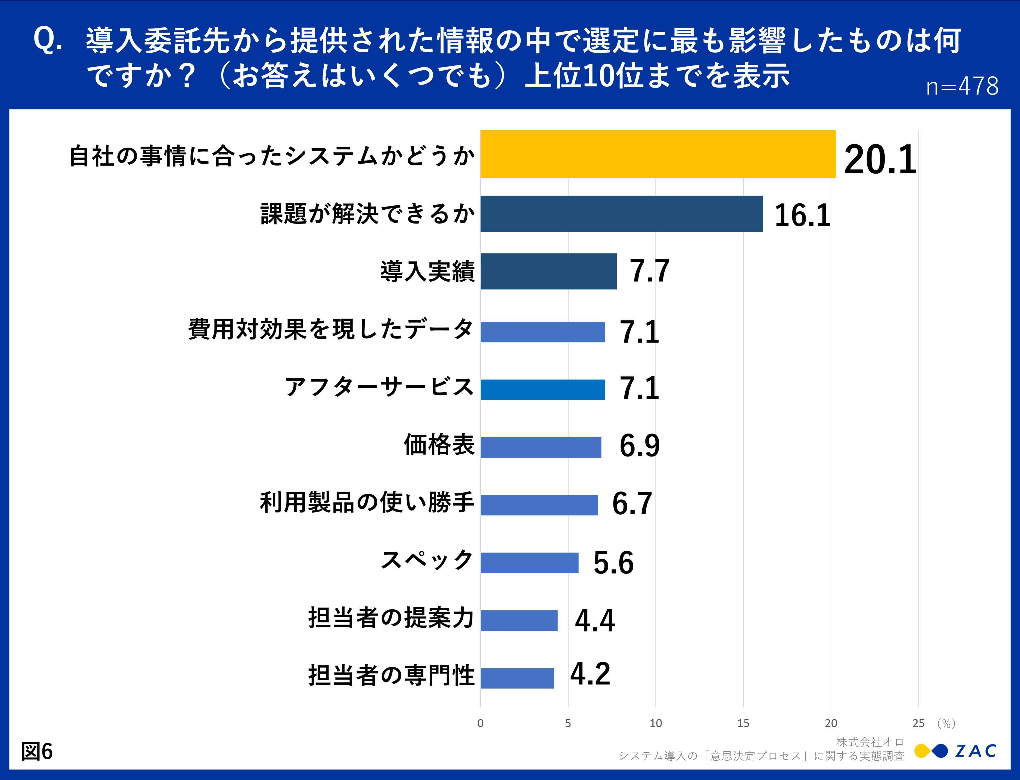 導入委託先から提供された情報の中で選定に最も影響したものは何か?という質問では、「自社の事情に合ったシステムかどうか」20.1%と最も高い割合になっており、続いて「課題が解決できるか」16.1%、「導入実績」7.7%、「費用対効果を現したデータ」7.1%、「アフターサービス」7.1%となっています。(図6)