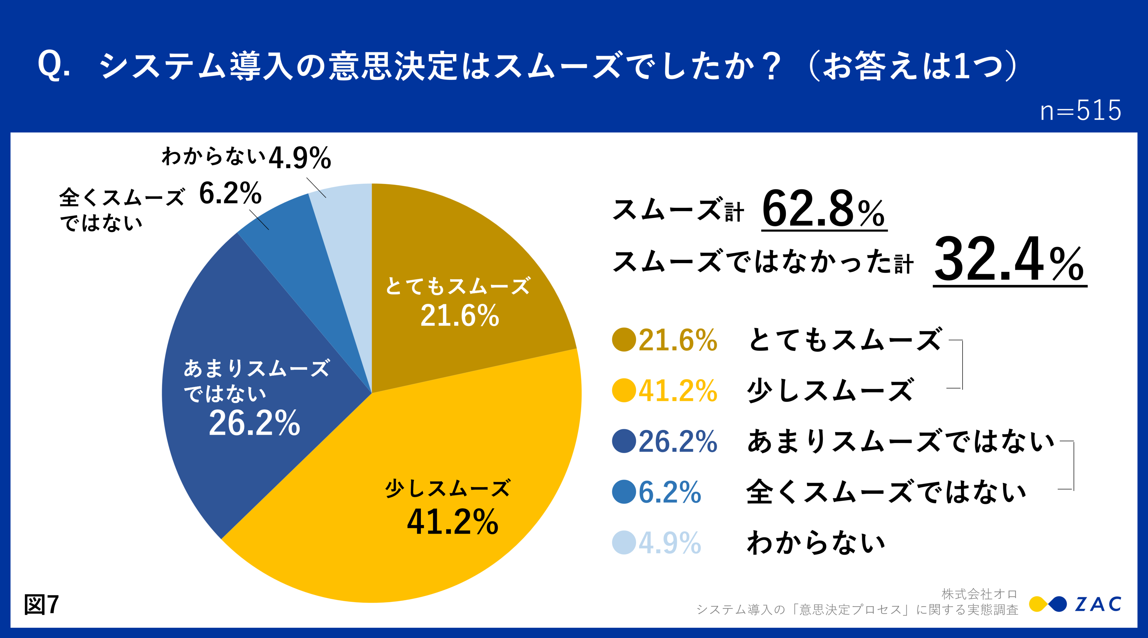 システム導入の意思決定はスムーズだったかという質問では、「とてもスムーズ」21.6%、「少しスムーズ」41.2%、「あまりスムーズではない」26.2%、「全くスムーズではない」6.2%という結果でした。(図7)