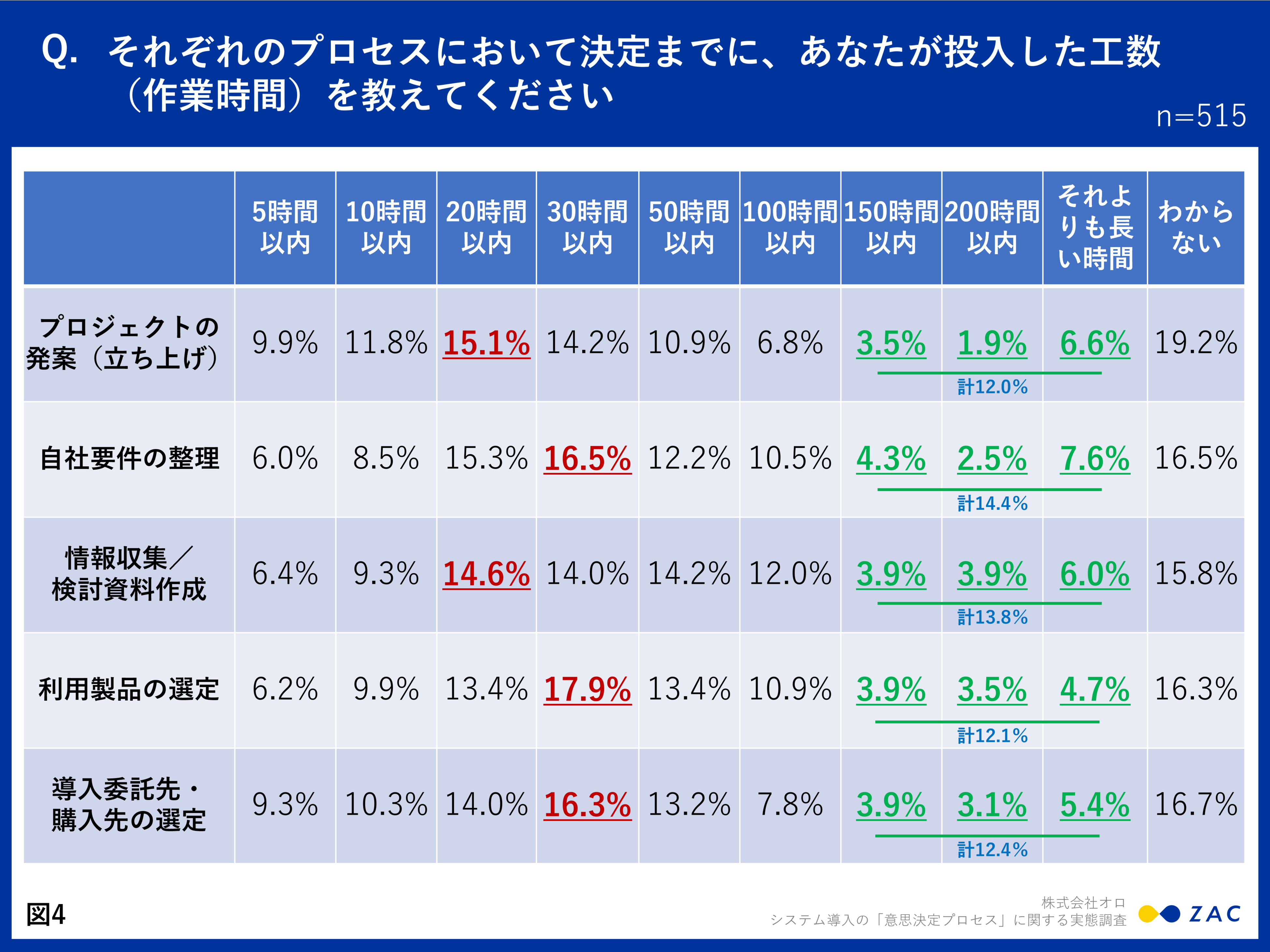 それぞれのプロセスにおいて決定までに投入した工数(作業時間)はどれくらいだったのかについて質問したところ、それぞれ最も多かったのは下記の結果となりました(図4)。