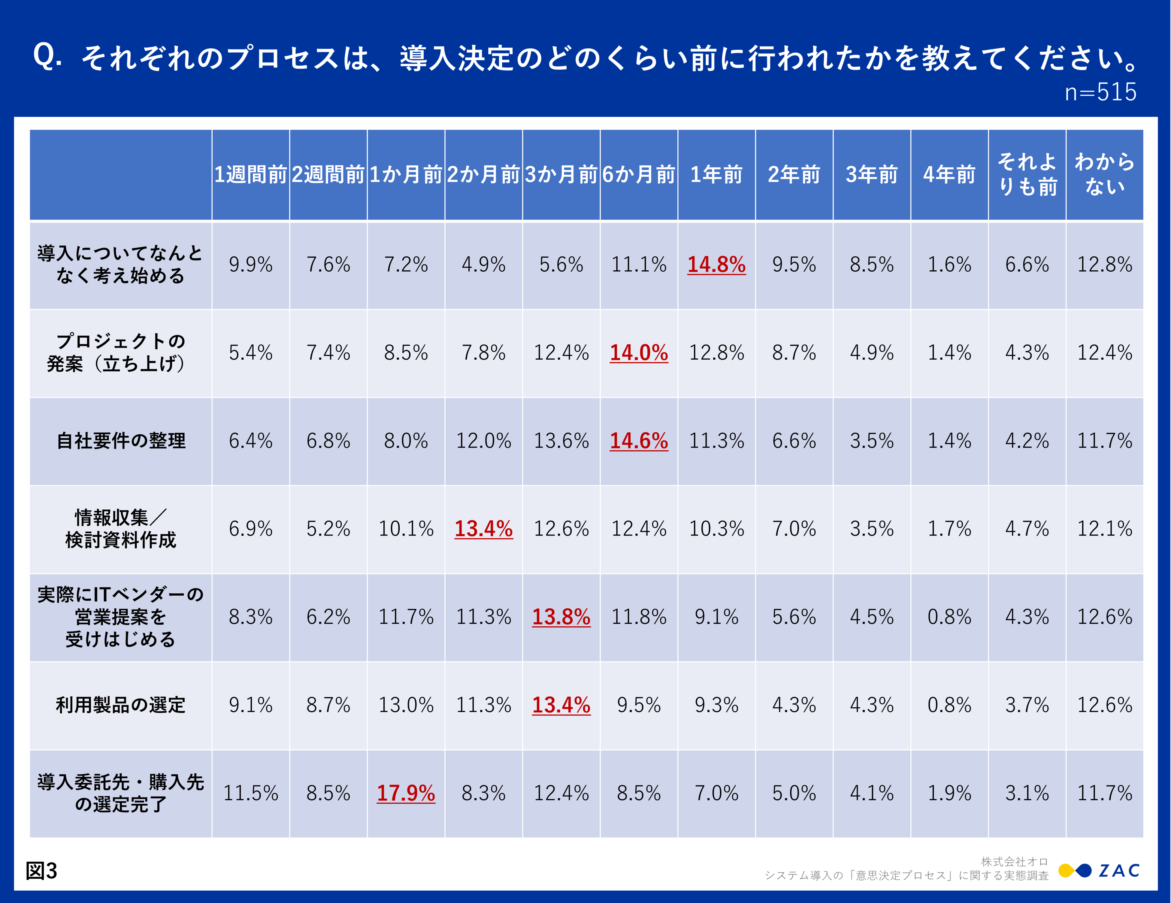 それぞれのプロセスが、導入決定のどのくらい前に行われたかを質問したところ、それぞれ最も多いのは下記の結果となりました(図3)。