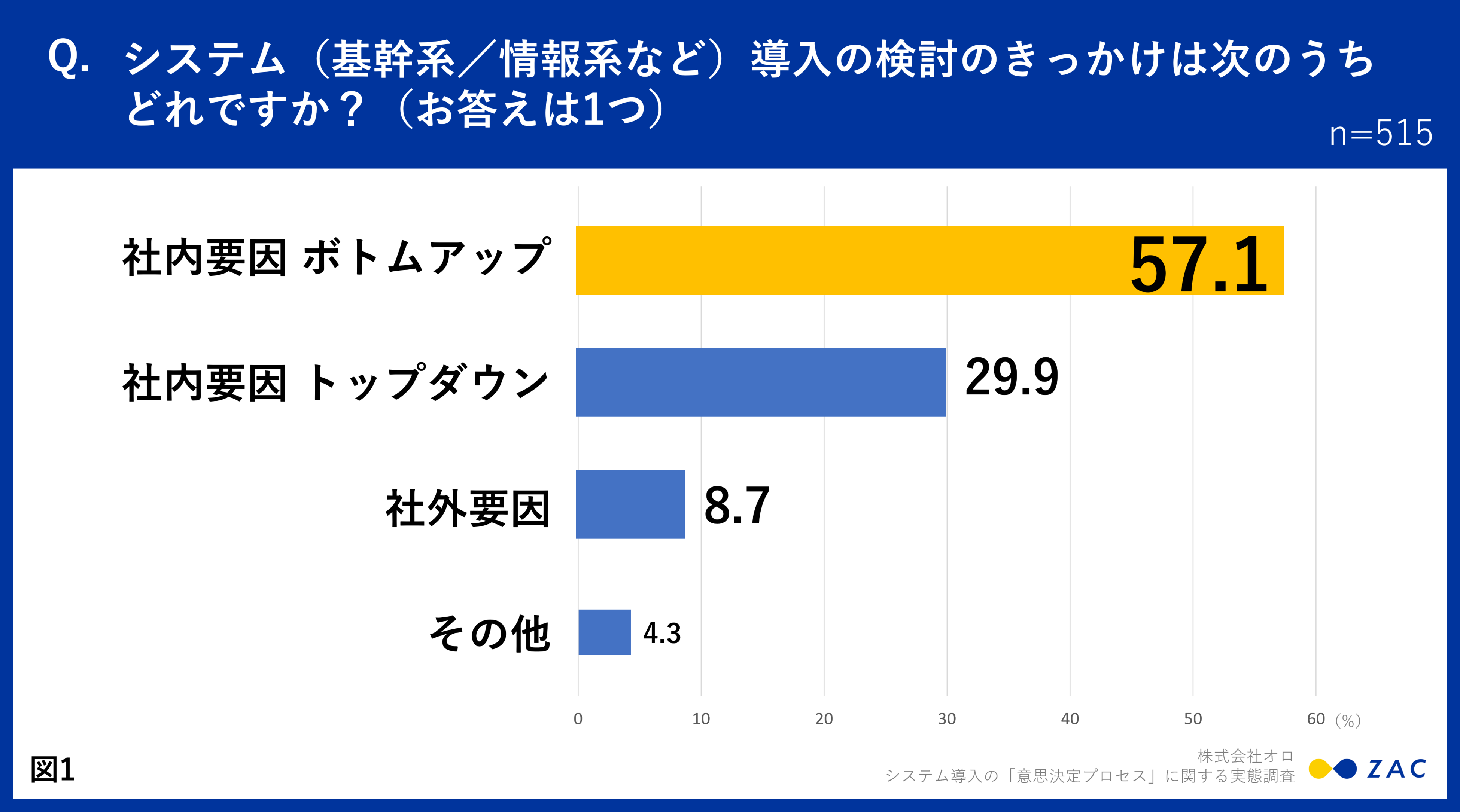 システム(基幹系/情報系など)導入の検討のきっかけは何かを質問したところ、「ボトムアップ(現場からの提案)」57.1%。「トップダウン(代表からの指示)」29.9%。「社外要因」8.7%という結果になりました。(図1)