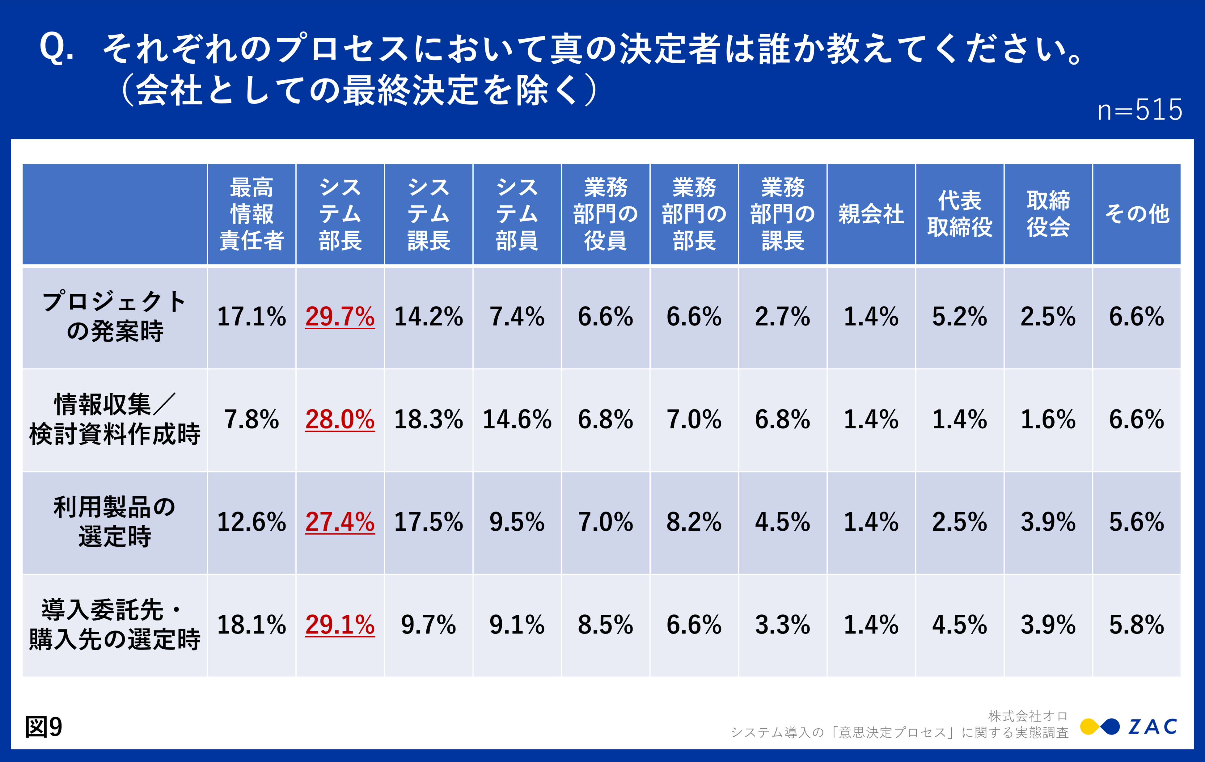 それぞれのプロセスにおいて真の決定者は誰かという質問では、すべてのプロセスのおいて、最も割合が高かったのが、「システム部長」という回答でした。(図9)