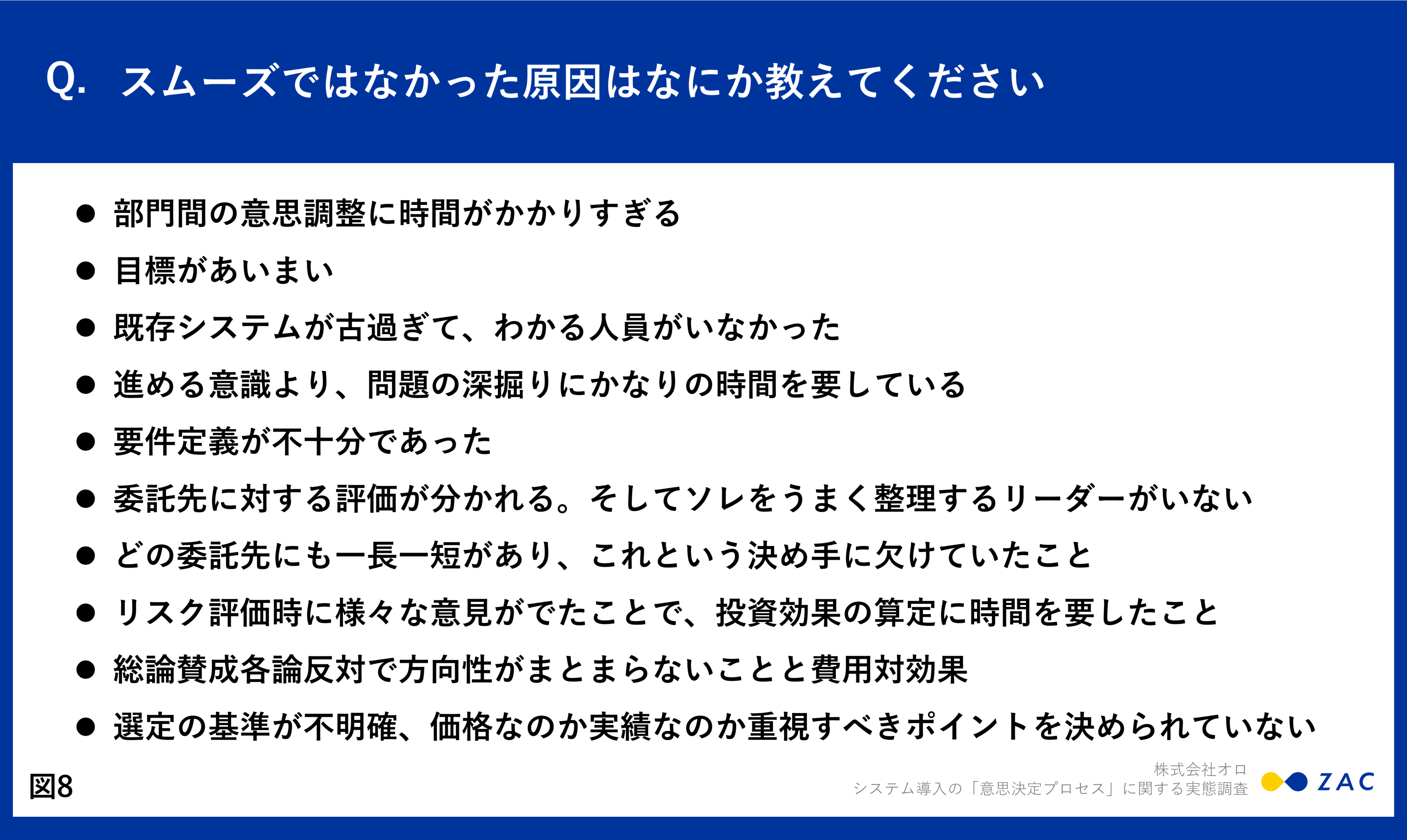 スムーズではなかった原因を聞いてみると、「部門間の意思調整に時間がかかりすぎる」「目標があいまい」「既存システムが古過ぎて、わかる人員がいなかった」「進める意識より、問題の深掘りにかなりの時間を要している」「要件定義が不十分であった」「委託先に対する評価が分かれる」などの要因があがりました。(図8)