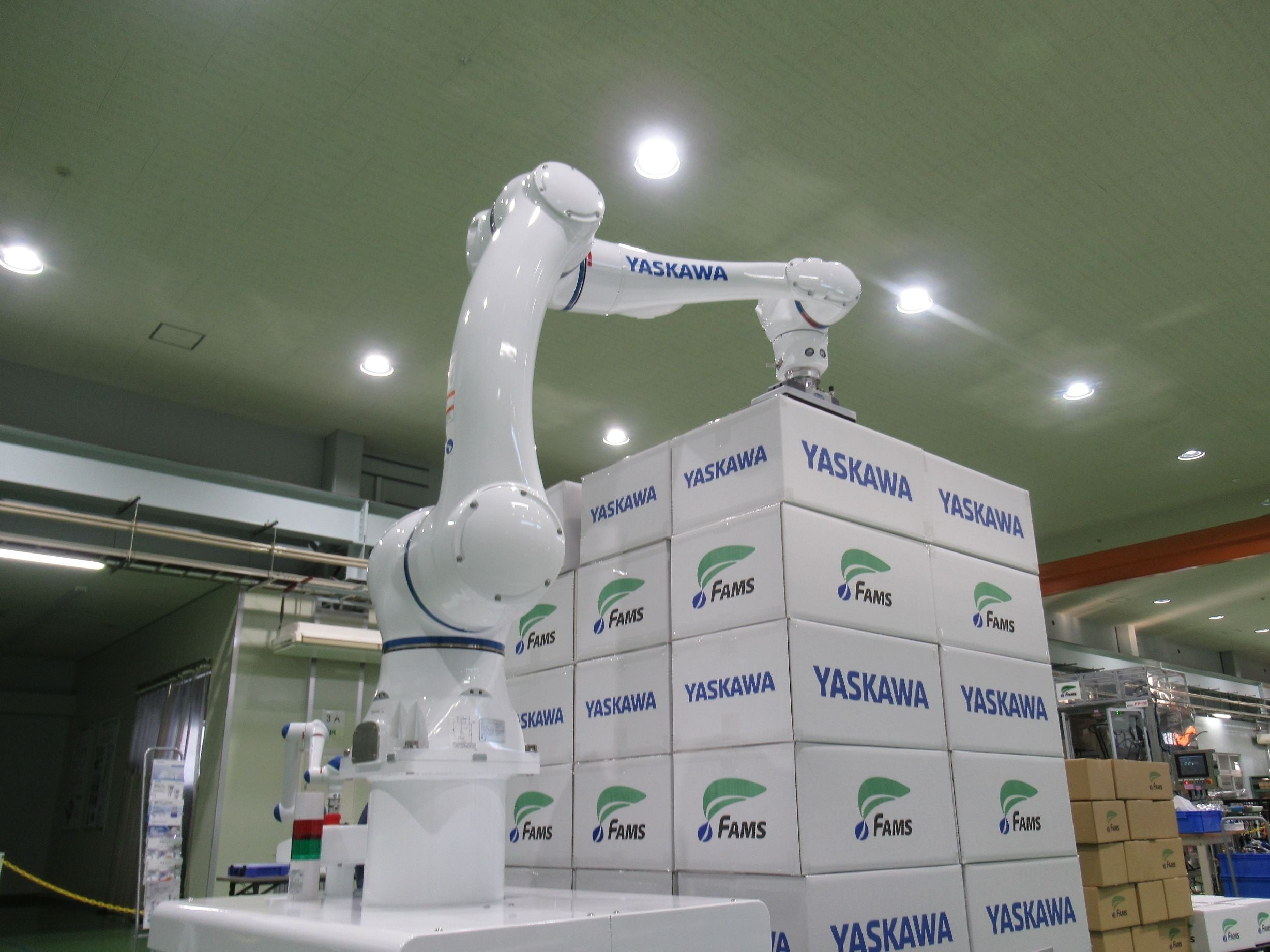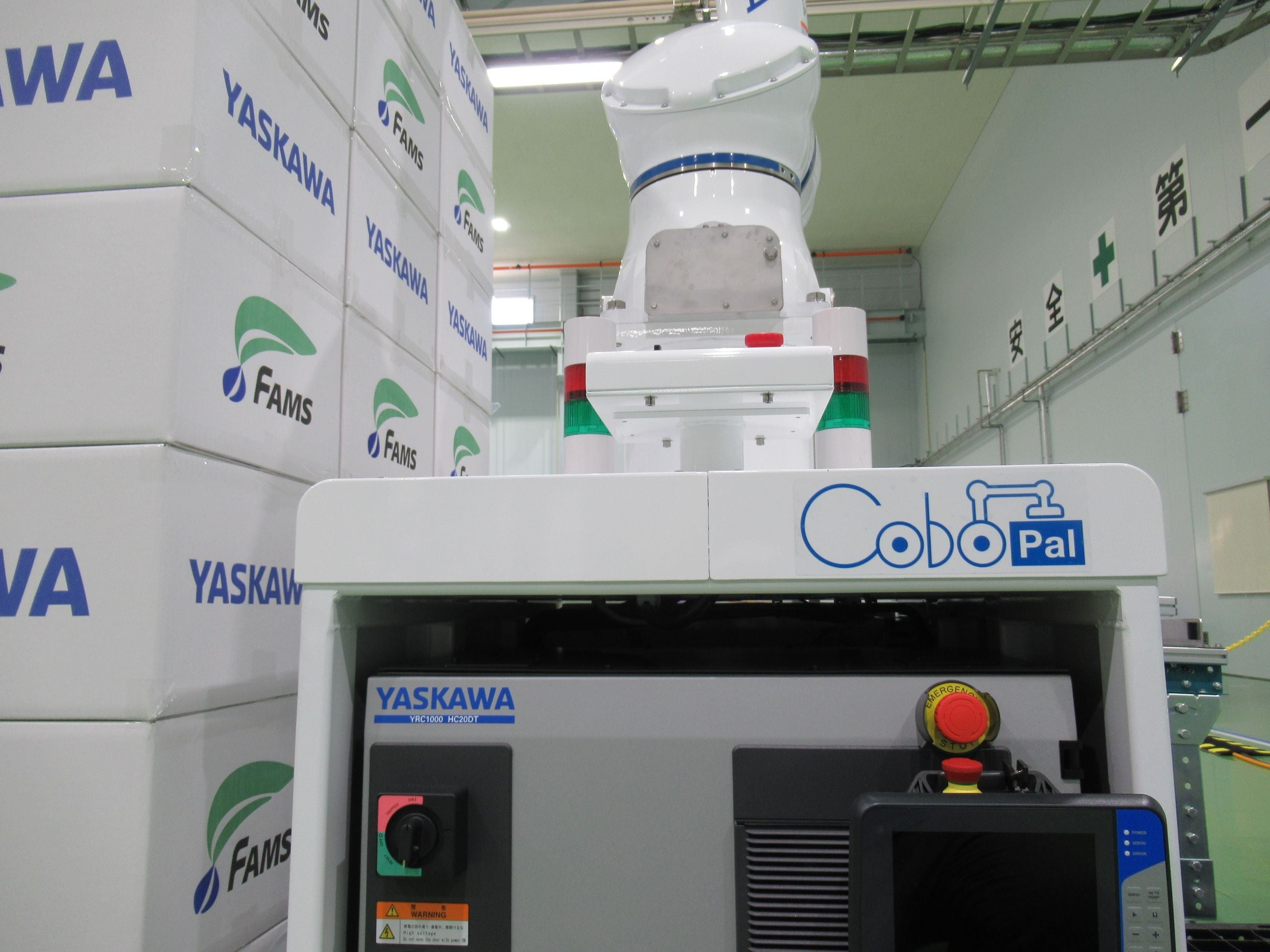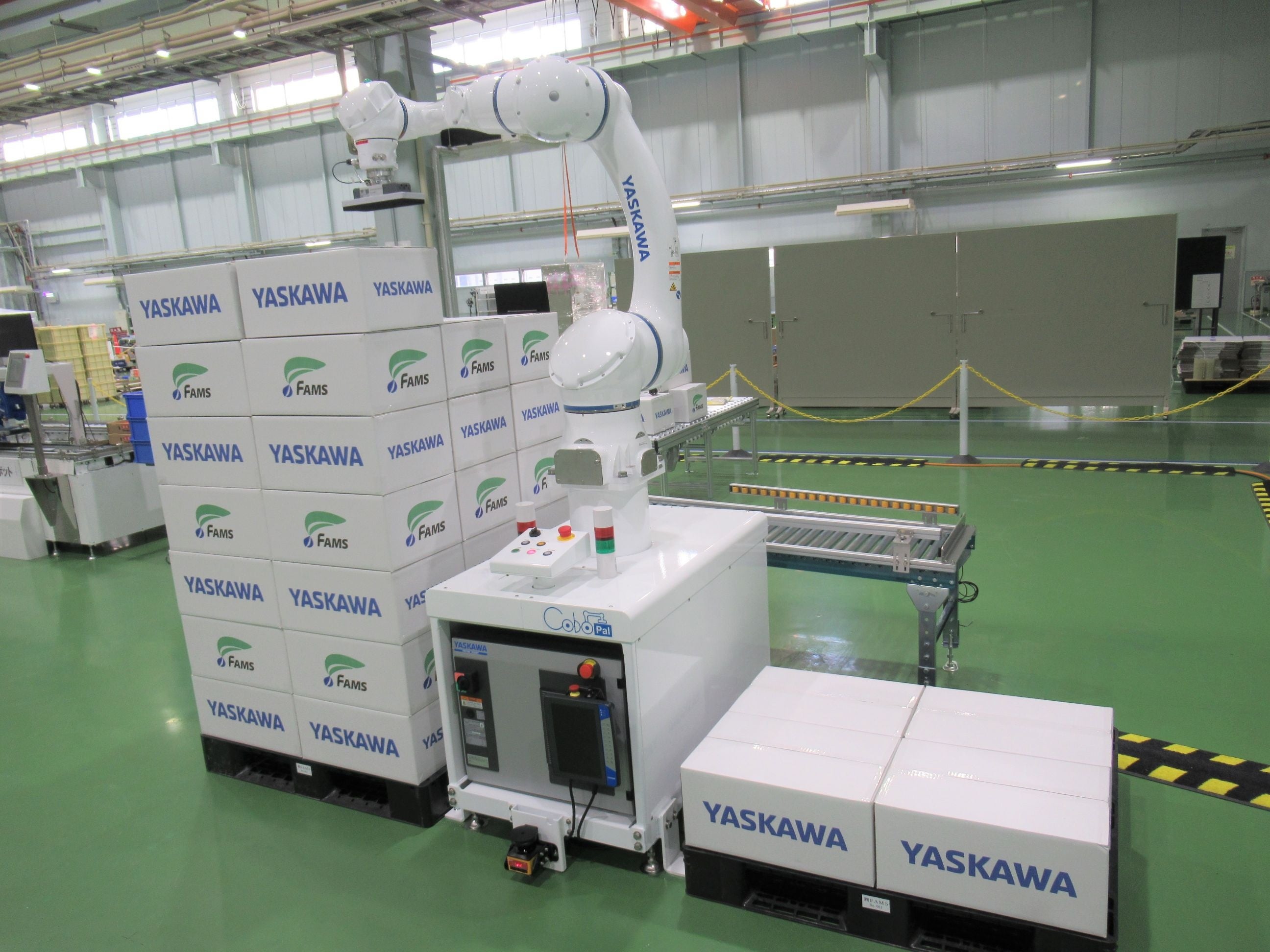 CoboPal(コボパル)は株式会社FAMSがリリースした人協働パレタイザで、安川電機製人協働ロボット(HC10DTP、HC20DTP、HC30PL)を使用したパレタイジング用途に適したシステムです