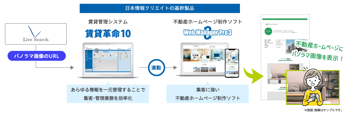 賃貸革命10、不動産BB、売買革命10に「Live Search Req」の360°パノラマ画像のURLを登録するだけで、ホームページ「WebManagerPro3」や業者間流通ページ「不動産BB」への掲載が可能となります。