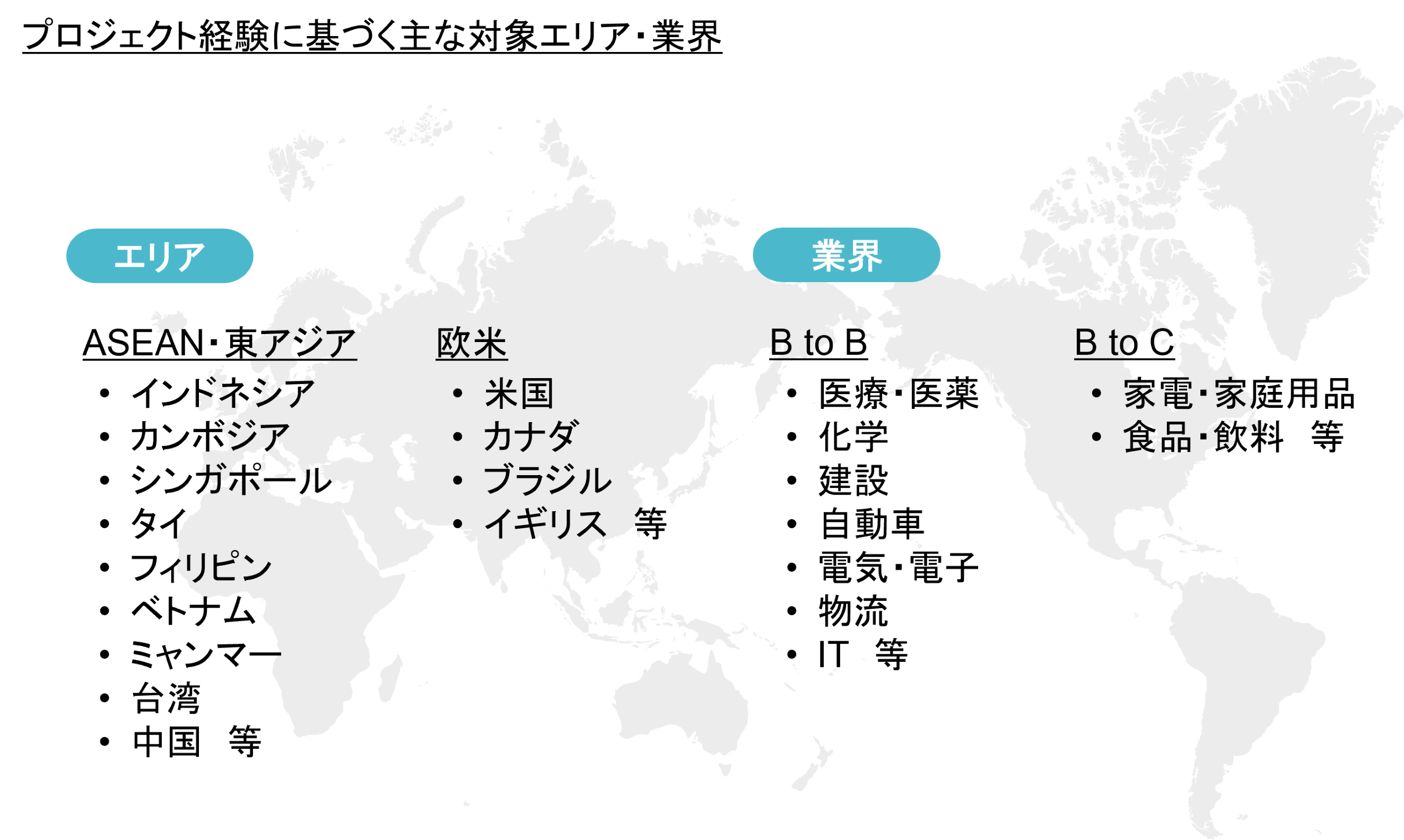 | 事業内容 | 日本企業、新興国等の海外企業の事業強化を目途とした • グローバルコンサルティング事業 • ITコンサルティング、システム開発支援事業 • プロジェクトマネジメント事業 |
