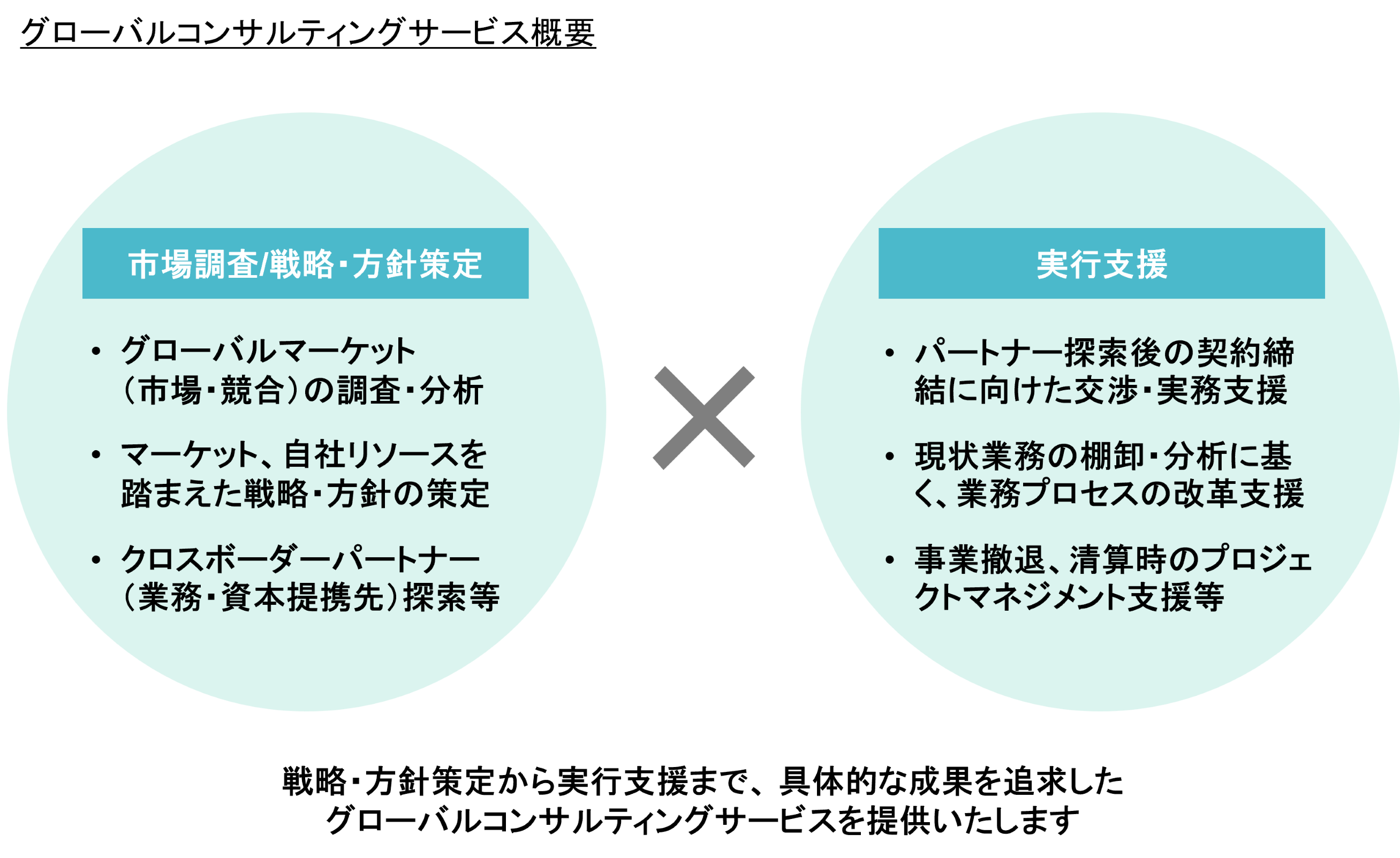 多くのグローバルプロジェクトでのプロジェクトマネジメント支援経験を活かし、パートナーとの業務提携や資本提携、M&A等のクロスボーダーアライアンス締結支援、事業撤退・清算支援等の実行支援を行います。