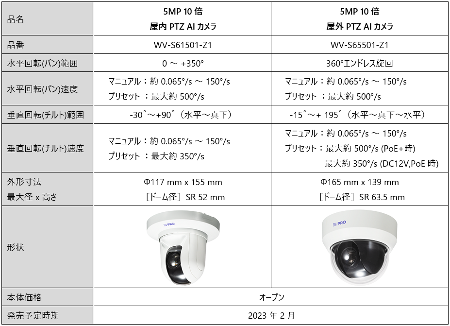 今回追加した屋内用1機種、屋外用1機種は、5MP対応の高解像度モデルでありながら、2MP(1080P)対応モデルと同じ、設置場所を選ばないコンパクトな筐体を実現しました。高性能のPTZ動作やAIアプリケーション機能とあわせて、より広範囲、より高精度な撮影や画像解析に威力を発揮します。