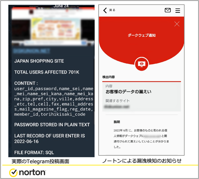 情報漏洩をした可能性があることから、ダークウェブを調査したケースなどもありました。また、実際にSNSのTelegram(テレグラム)で企業から漏洩した日本人の個人情報が公開されていることも確認されています。(ノートンでは、こちらの漏洩に個人情報が含まれていたユーザーに対してダークウェブモニタリング機能により漏洩通知をアプリ等でお送りしました。)最近では、漏洩した個人情報をダークウェブで取引するだけではなく、テレグラムなどで一部無料公開しているケースが確認されています。