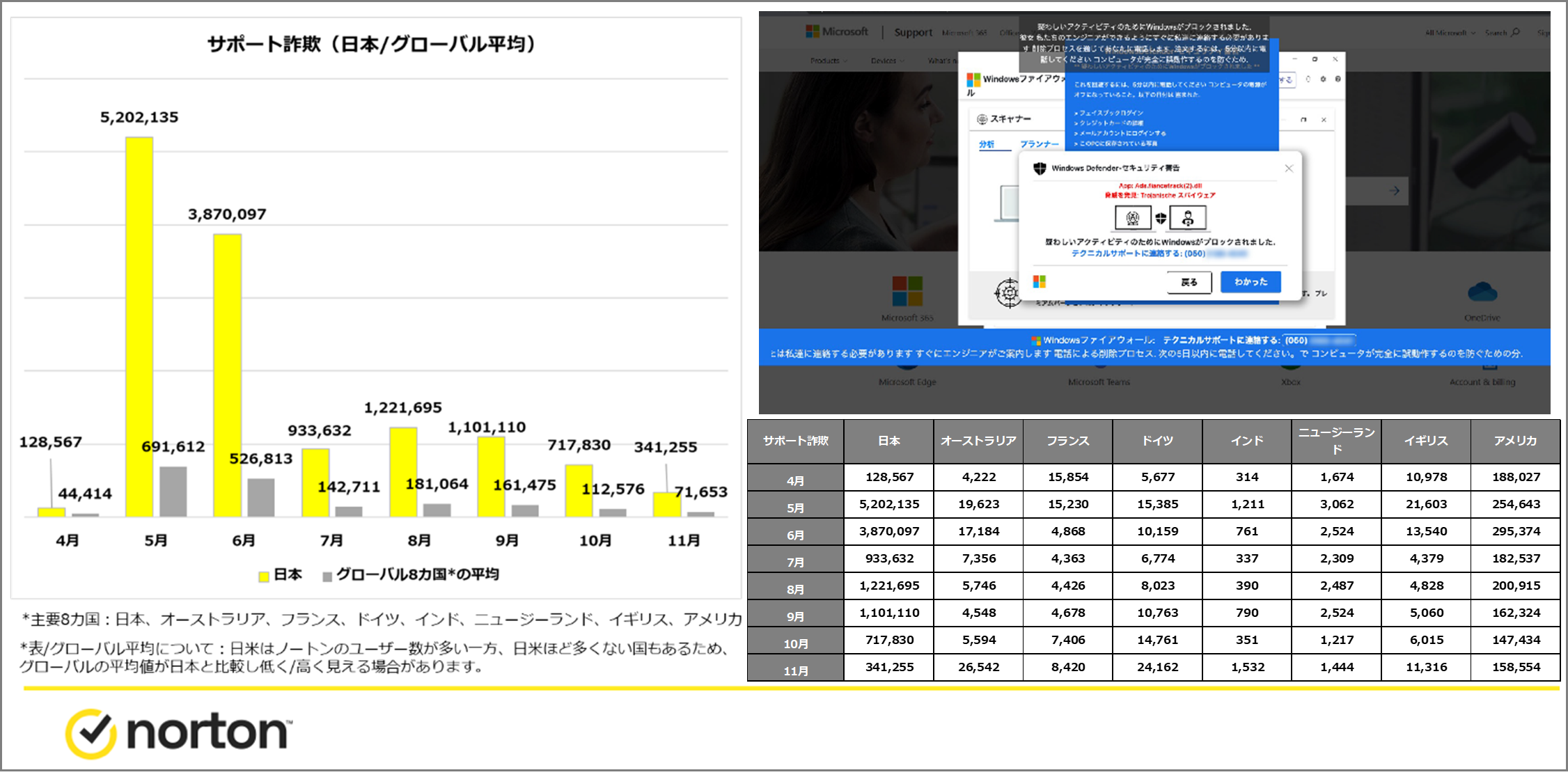 2022年1月〜11月に、ノートンが日本でブロックしたサポート詐欺の件数は、約2,287万件とフィッシング詐欺のブロック件数(約3,087万件)と大きく変わらない件数でした。月ごとのブロック数(2022年4月~11月)においては、日本でのブロック件数が、主要8カ国*1と比較し圧倒的に多く、ノートンユーザーが1番多いアメリカと比較しても、桁が1つ違う月もありました。2021年頃は、各言語に翻訳された同様のサポート詐欺ページが世界中で確認されましたが、より多くの日本人が、詐欺の電話番号へ電話をしてきたためか、日本を集中的にターゲットとし詐欺行為を強化した可能性があります。