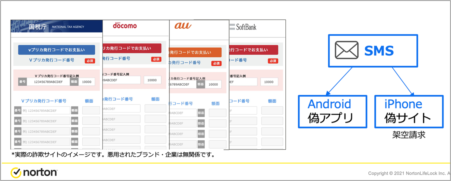 テンプレートを使いまわしたような詐欺SMSが、2022年はたびたび確認されました。携帯キャリア会社各社や、国税庁などをかたり「未払金がある」との警告ポップアップメッセージが表示され、「支払い期限」としてページ上にはページを開いた日付が表示され、ギフトコードによる支払いを求めます。