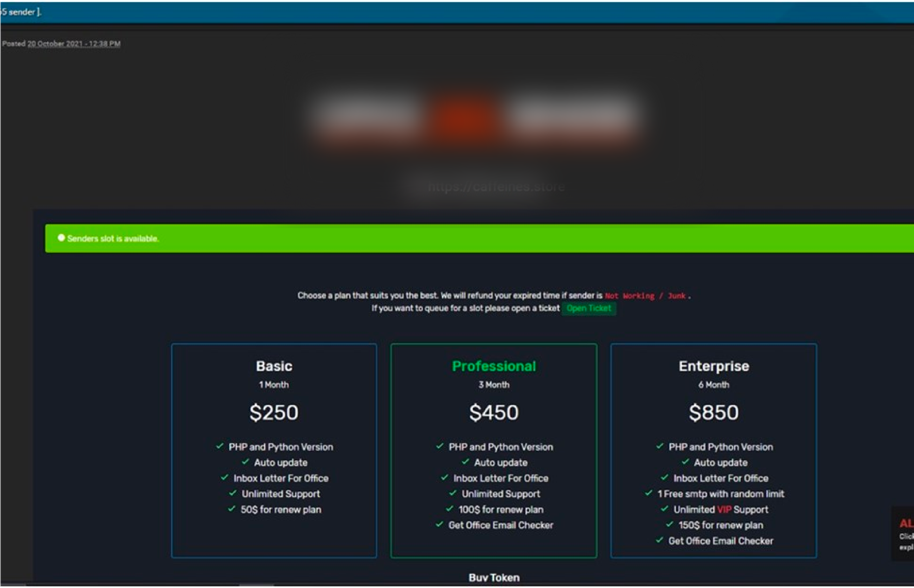サイバー犯罪者間では、ダークウェブ上で、サイバー犯罪のマニュアルやトレーニングが売買されている他、ランサムウェア攻撃を容易にするランサムウェアの提供サービス(RaaS:ランサムウェアアズアサービス)やフィッシング詐欺を行うことを容易にするフィッシングのサービス (PhaaS:フィッシング・アズ・ア・サービス)があります。フィッシングのサービス(PhaaS)は、フィッシング詐欺のキットの用意や、リダイレクトするページの管理などフィッシング詐欺を行う上で必要な機能を包括的に提供するサブスクリプションサービスですが、かつてはダークウェブのフォーラム上で推薦や紹介を受けなければ利用できませんでした。
