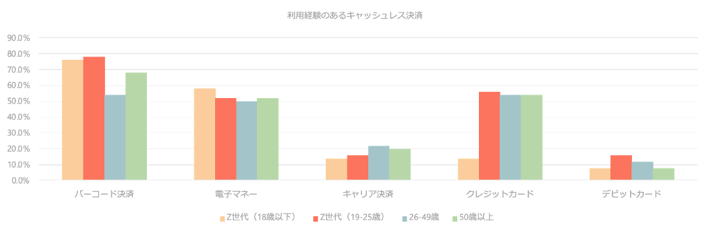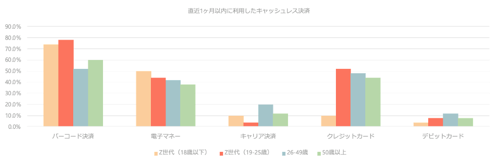 Z世代は、キャッシュレス決済の中で「バーコード決済」の利用率が最も高い。Z世代の中でも19歳以上の世代では、「クレジットカード」の利用率が高い。