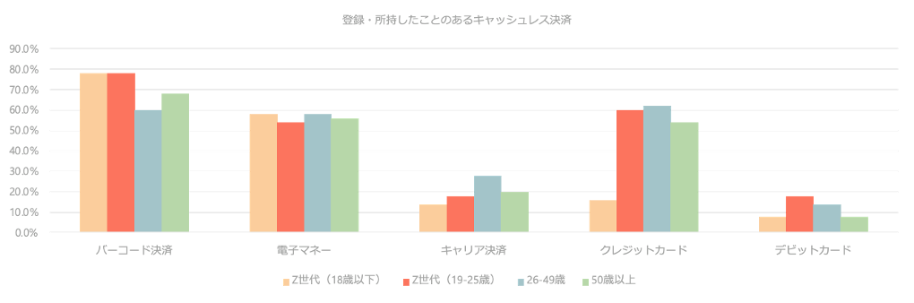 Z世代は、キャッシュレス決済の中で「バーコード決済」の登録・所持率が最も高かった。Z世代の中でも19歳以上の世代では、「クレジットカード」の所持率が高い。