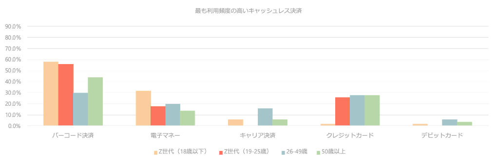 Z世代は、キャッシュレス決済の中で「バーコード決済」の利用頻度が最も高い。また、Z世代は、一度バーコード決済を使うとそのままバーコード決済が最も利用するキャッシュレス決済手段になる傾向が見られる。