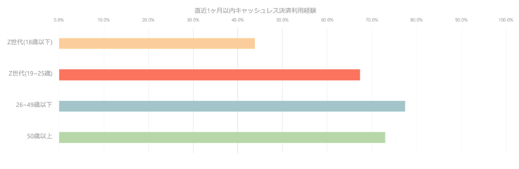 調査対象者に対し、キャッシュレス決済の直近1ヶ月以内での利用経験率を聴取し、世代別で比較したところ、他世代に比べZ世代の方がキャッシュレス決済を利用していないという結果が出た。