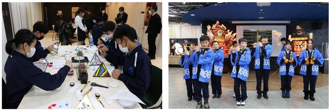 材料も制作技法も実際のねぶた制作に使用されているものであり、「ねぶた」の魅力を身近に感じていただくことができました。さらに、青森会場からの青森北中学校の生徒によるお囃子の演奏や、ベトナム会場からのランタン祭(ベトナム・ホイアンで開催)の紹介と参加者の皆さまによる民族衣装アオザイのお披露目を通じ、日越文化交流の場ともなりました。