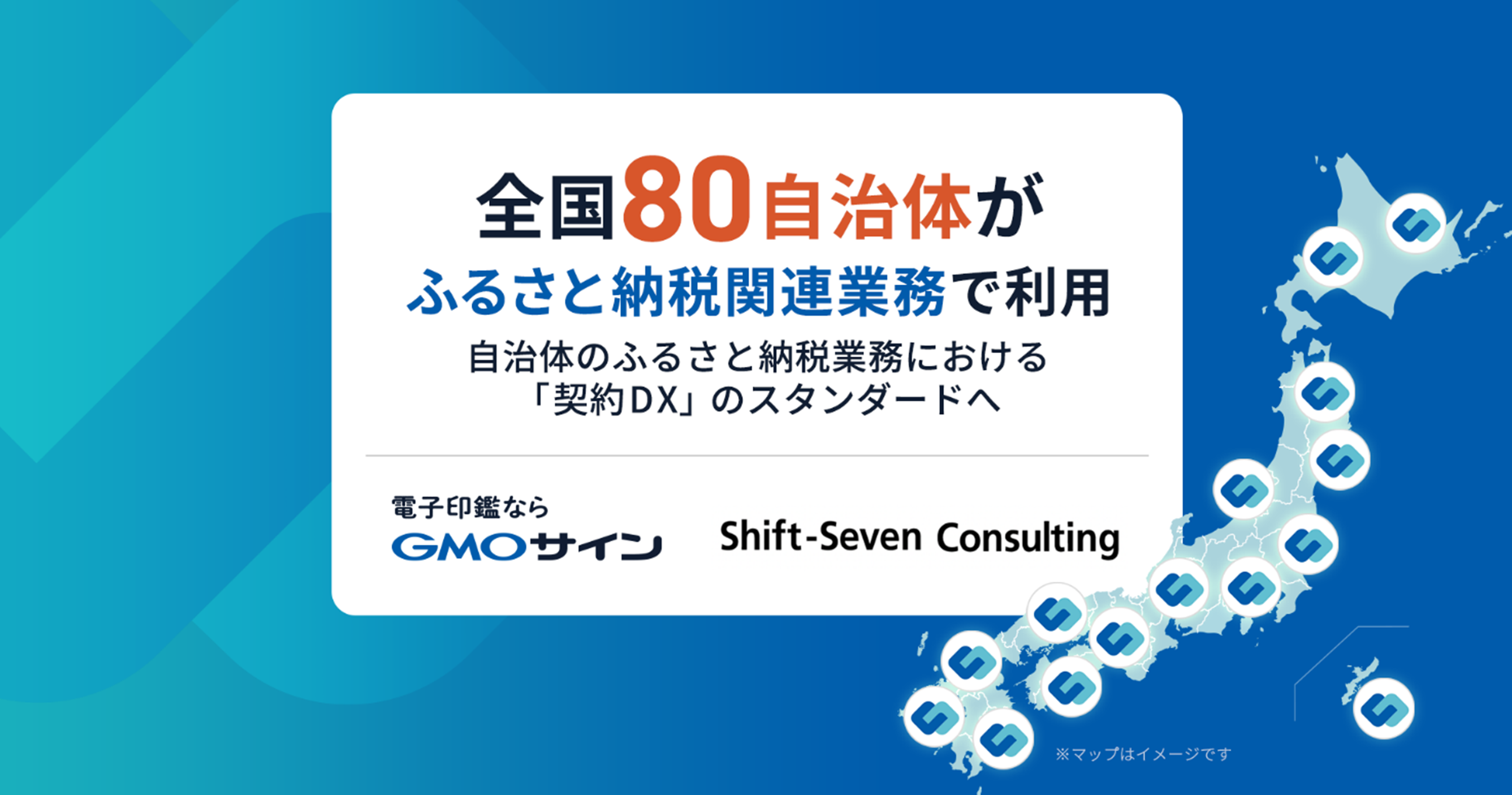 そのような中、両社は、2022年8月から、自治体の電子契約・DX推進において協業を進めてまいりました(※3)。その取り組みの一つとして、シフトセブンが提供する自治体別ふるさと納税寄附後の寄附者専用ページサービス「自治体マイページ」において、シフトセブンと自治体との契約締結は原則「電子印鑑GMOサイン」を用いる事で合意し、GMOグローバルサイン・HDが自治体へ電子契約の丁寧な解説や操作フォローを行うことで、利用自治体数が全国80自治体に達しました。