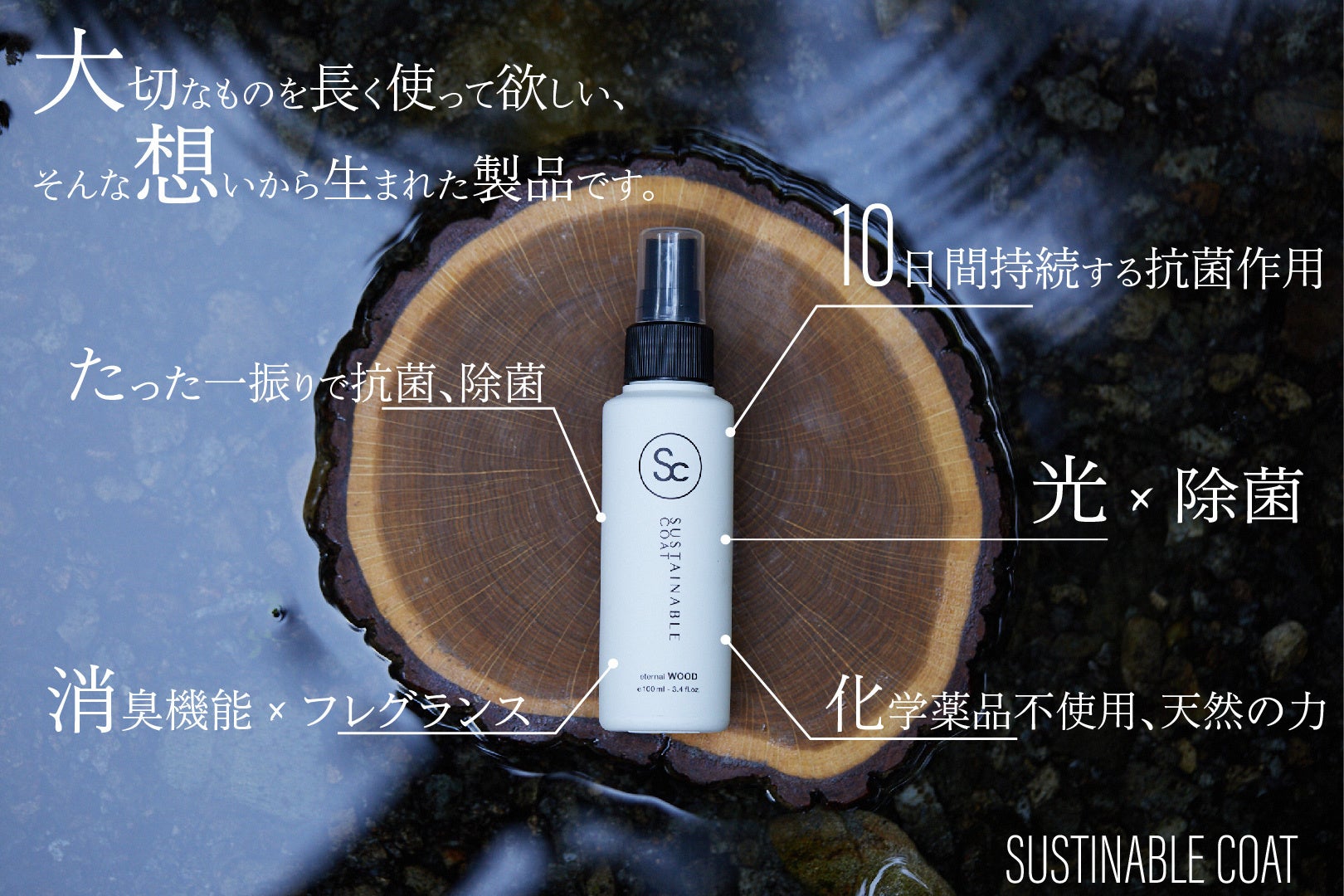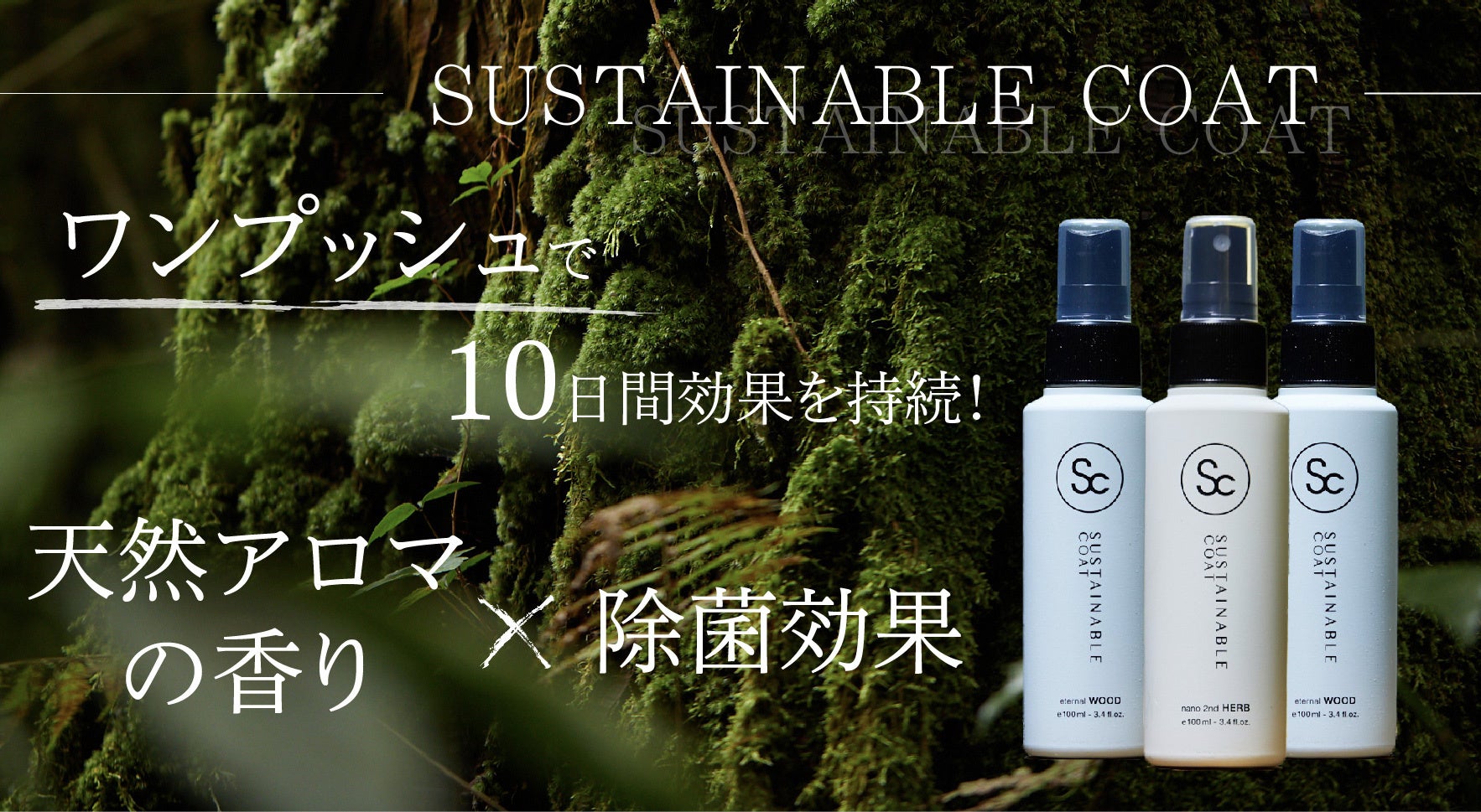 Sustainable Coat®はアロマの香りとエコロジカルで、高い除菌力があります。光触媒は環境に優しく、
