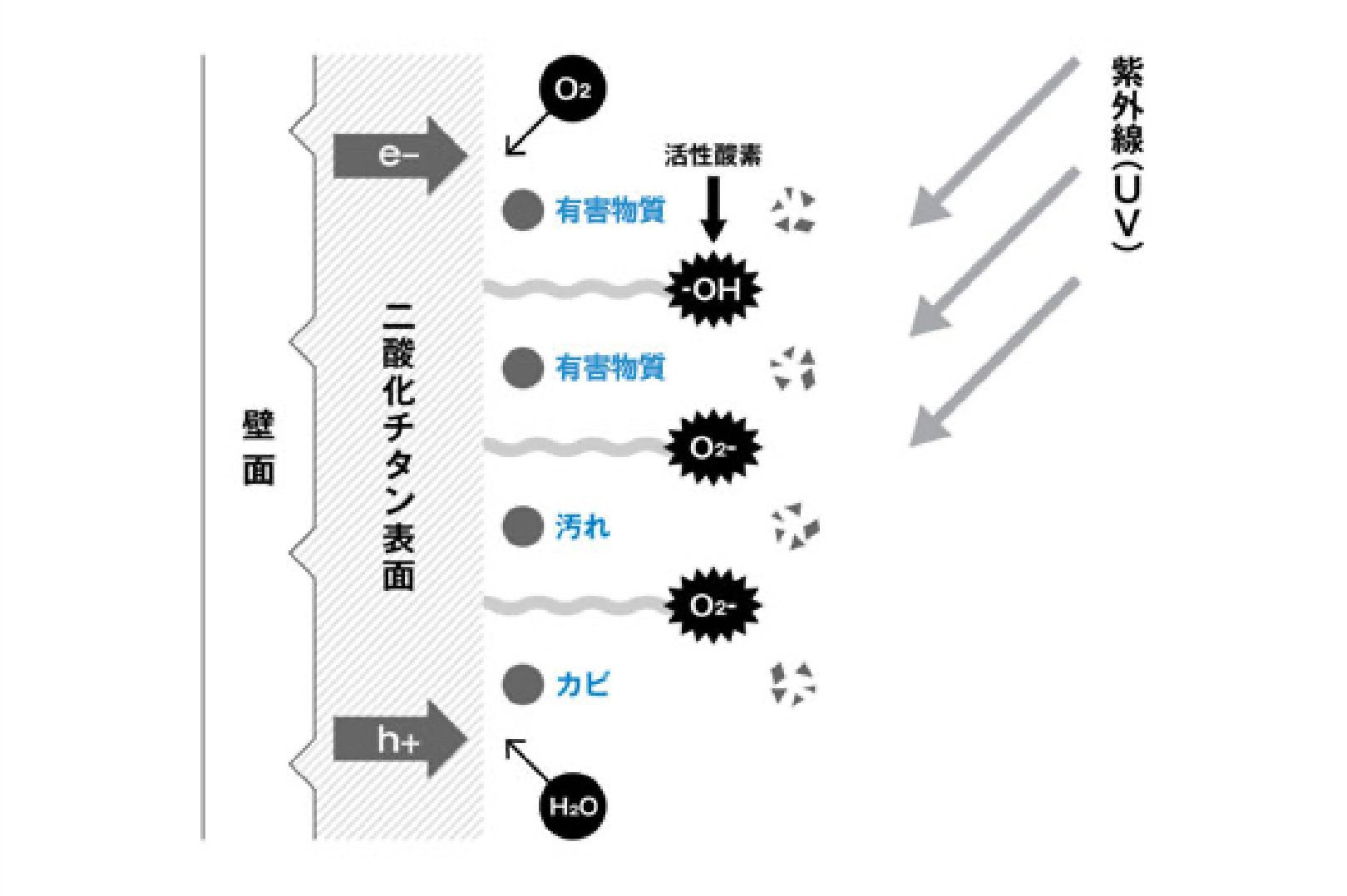 光触媒技術は、主成分の二酸化チタンが光に当たることによって、菌や有害物質を無害な水と二酸化炭素に分解します。この光触媒による防汚機能や抗菌・消臭機能は、日本で生まれた自然エネルギーです。