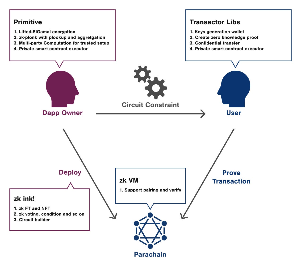 Zero NetworkはSubstrateでパラチェーンとして実装され、Polkadotに接続されます。Zero NetworkがPolkadotに接続されるとその相互互換性によりネットワークに繋がる全てのパラチェーンが秘匿化の恩恵を受けることができます。