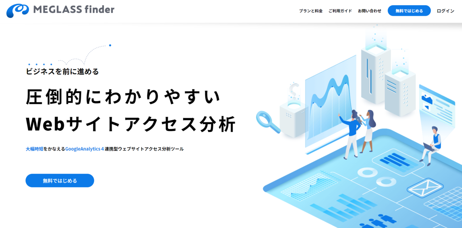 当社はこのような状況を解決するために、専門的な知識がなくても簡単にGA4のデータを用いたWebサイトアクセス分析を可能にする「MEGLASS finder」を開発しローンチを予定しています。このたびサービスサイトをプレオープンし、導入のご相談やお問合せの受付を開始いたしました。