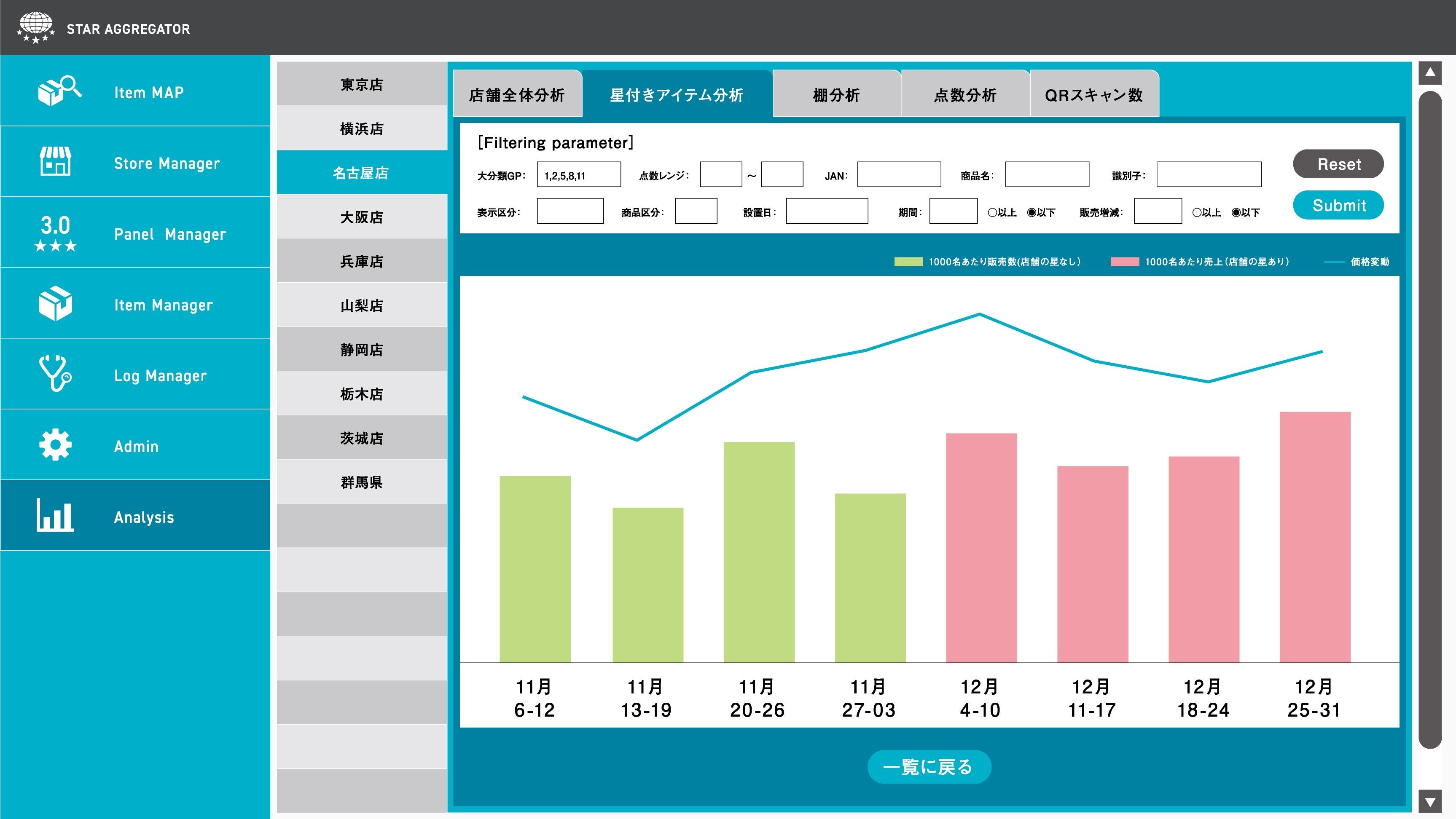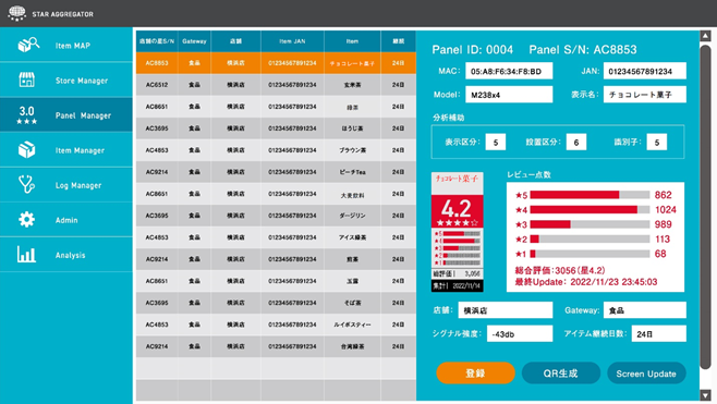 「店舗の星」は、ECの世界で極めて重要である、商品及び店舗に関する消費者評価(ソーシャルプルーフ)をネット上よりクラウドエンジンがスクレイピングし、リアル店舗に落とし込み表示する為のシステム(以下、「店舗の星」システム※)になります。小売店舗で商品を購入する際、馴染みのなかった商品や、嗜好性の高い商品を選択するには、消費者のその商品に対する認知度が重要な鍵になってまいります。一方、消費者が商品選択に費やす時間は、低額商品の場合、ほんの数秒である事から、消費者が数秒以内に認知可能であり、かつ、商品の良さの定量的判断の助けとなる「店舗の星」は、リアル店舗の販売促進に大きな役割を果たしてまいります。また、当社の提供する「店舗の星」システムは、単に消費者評価を商品に表示するだけではなく、「店舗の星」を取り付ける前と取り付けた後の効果計測が可視化出来るクラウドダッシュボードを有しており、店舗のPOSデータと連携する事で店舗運営のBIツールとして極めて大きな役割を果たしてまいります。