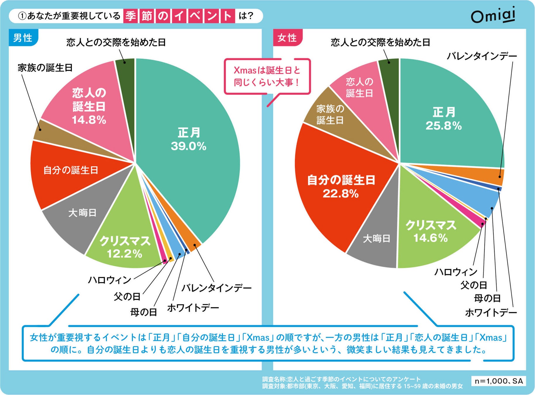 「あなたが重要視している季節のイベントは?(グラフ①)」のアンケートでは、男女ともに1位はお正月(男性39.0%、女性25.8%)。気になるクリスマスは男女ともに3 位にランクインしました(男性12.2%、女性14.6%)。