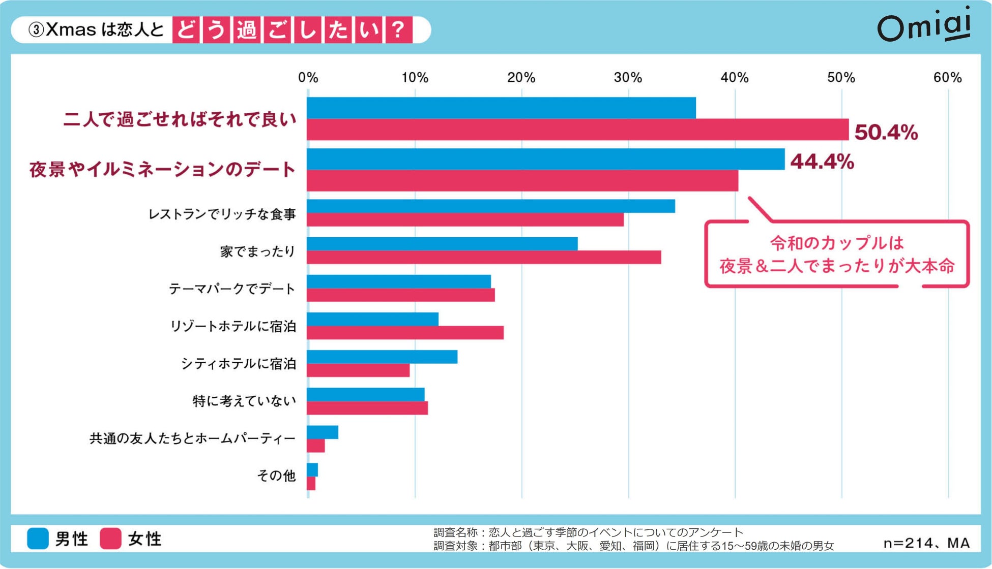 今回のテーマは「令和のクリスマス事情」に関するデータです。そのデータの中から見えてきたのは「ミニマム化」。令和の時代に恋をする男女にとって、クリスマスとはどのような存在なのか、15 歳~ 59 歳の未婚の男女1,000名を対象にOmiai Report 独自のアンケート調査を実施しました。