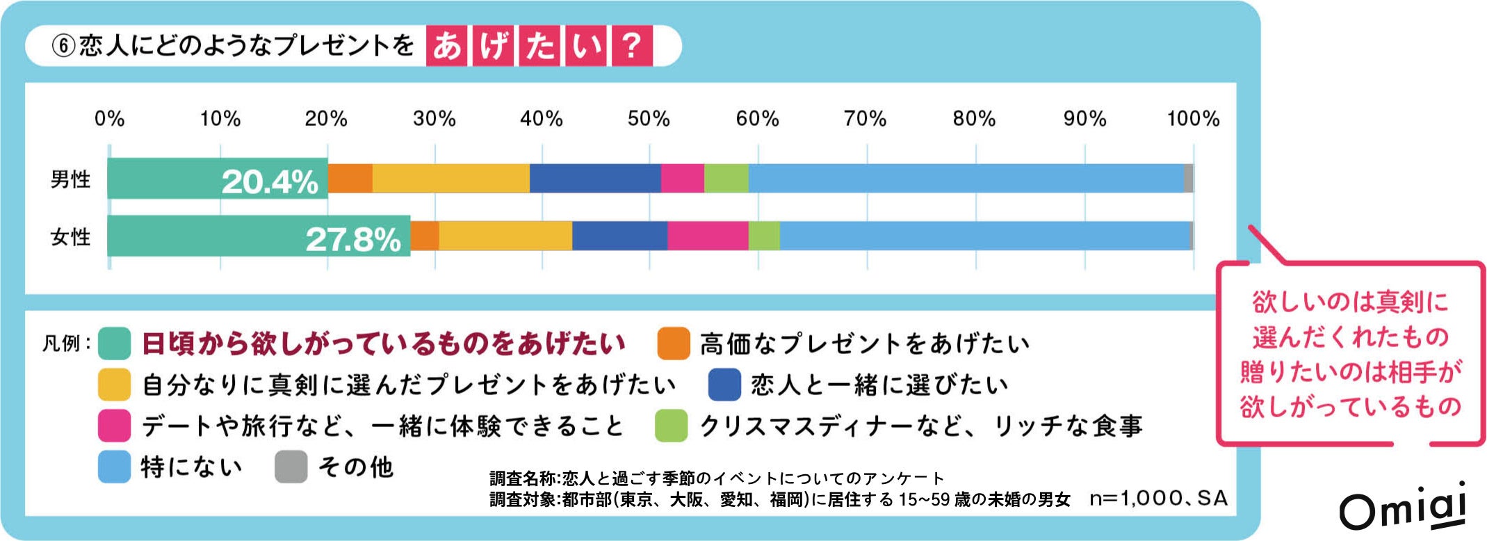 「恋人にどのようなプレゼントをあげたい?(グラフ⑥)」のアンケートでは、男女ともに「日頃から欲しがっているものをあげたい」という声が圧倒的で男性が20.4%、女性が27.8%(特にないを除く)。