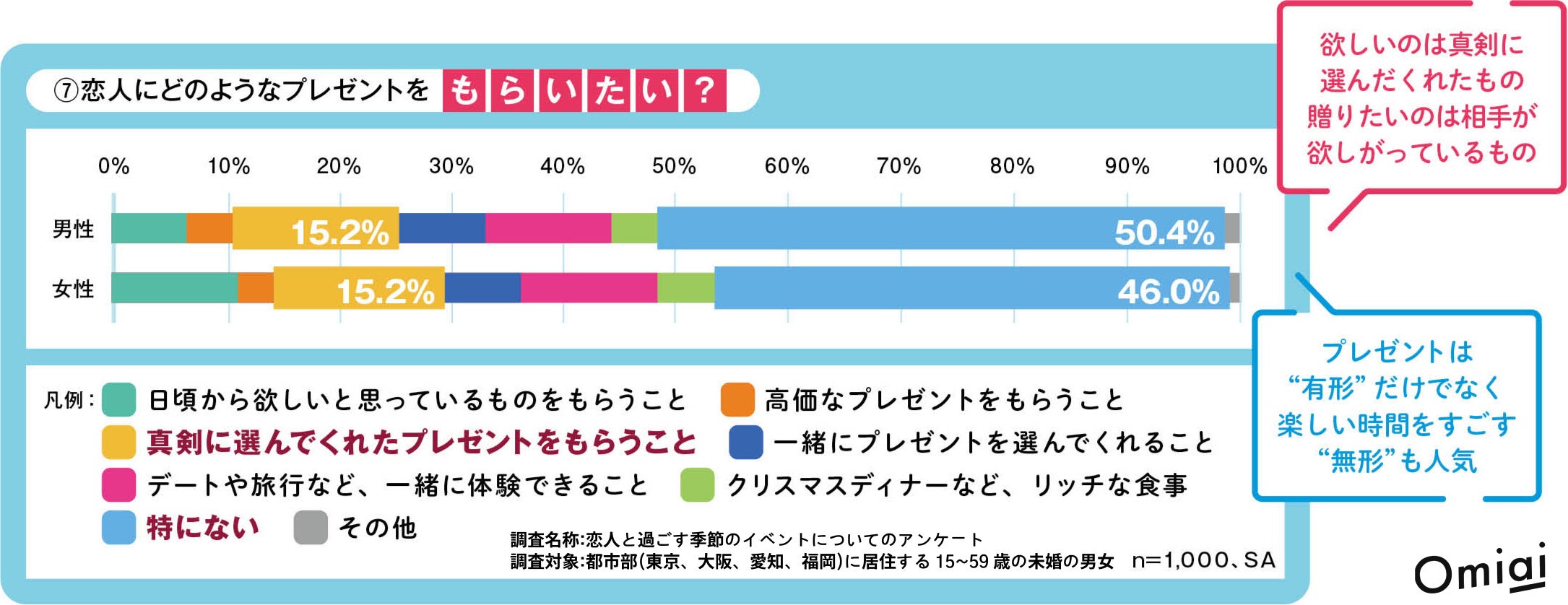ところが、「恋人にどのようなプレゼントをもらいたい?(グラフ⑦)」のアンケートでは、「特にない」が最多(男性50.4%、女性46.0%)で、次いで「真剣に選んでくれたプレゼント」を求める声が多い(男性15.2%、女性15.2%)という結果に。相手が「欲しがっているプレゼント」を贈りたいけれど、もらうプレゼントは「特にリクエストはない」し「真剣に選んでくれたもの」であれば嬉しいという何とも謙虚な意識が見えてきました。また、具体的なプレゼントを贈る“有形派”だけでなく、恋人と一緒の時間を過ごしたいという“無形派”が一定数(「デートや旅行など一 緒に体験できること」男性11.2%、女性12.0%、「クリスマスディナーなどリッチな食事」男性4.0%、女性5.0%)見られたのも興味深いデータです。