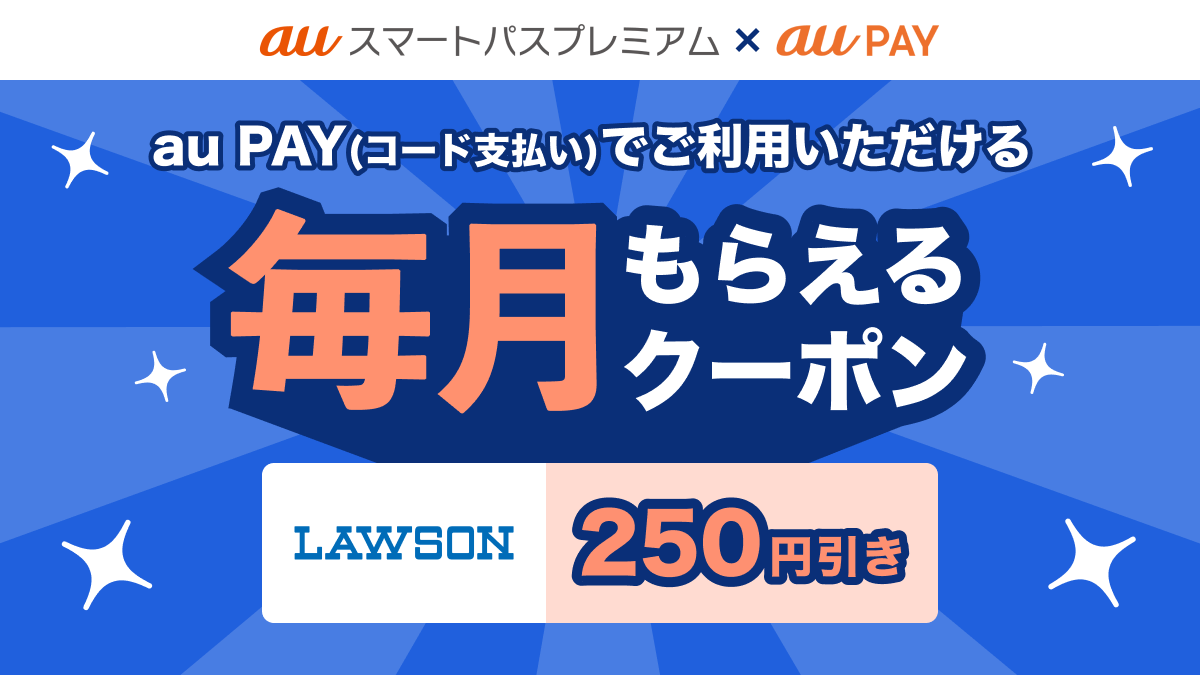 12月1日より、全国のローソン、ナチュラルローソン、ローソンストア100において、au PAYで251円以上のお買い物に使える250円割引クーポンを毎月1日配布中。
