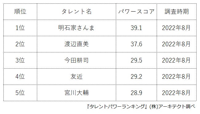 本ランキングは、2022年8月度に実施したタレント調査データ(一部過去実施データ)を利用し、タイトルに応じてランキング形式でまとめたものです。