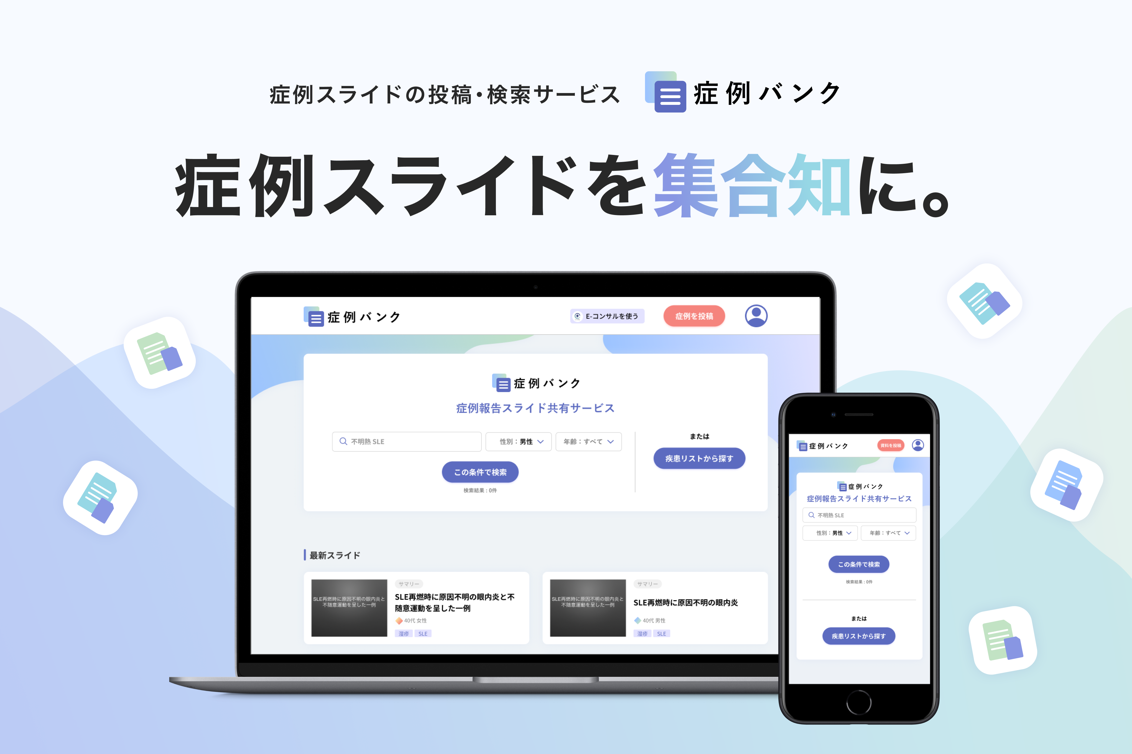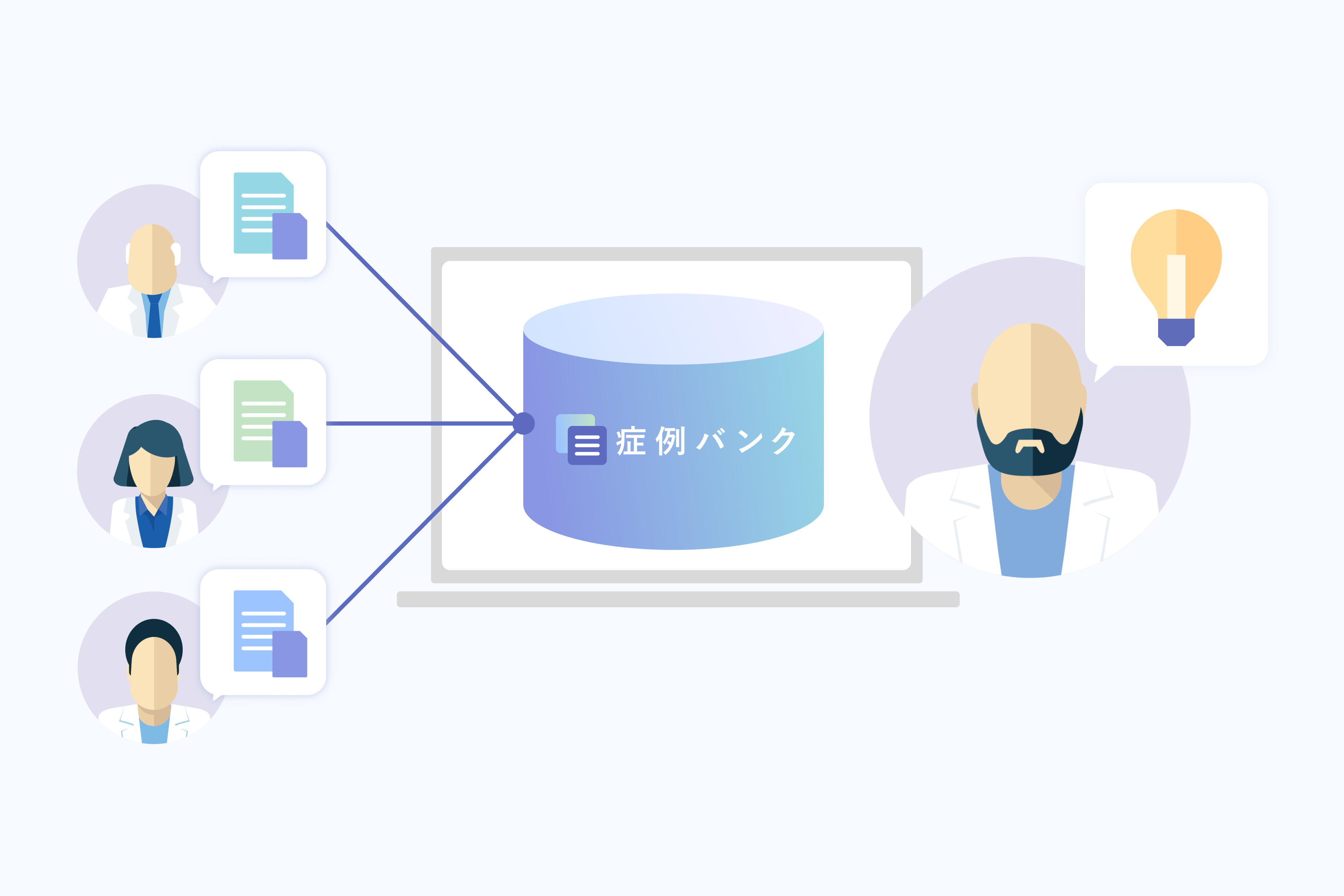 この効率化を促進するため、新たに提供開始した症例報告スライド共有サービス「症例バンク」は、全国の専門医の経験と知見を集合知にすることで、医師の情報収集を効率化し、希少疾患や明確なエビデンスがない疾患など、限られた類似症例の診断や治療に役立てていただけます。