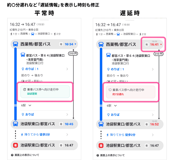 ・ルート詳細画面で、バスの平常運転時には「ほぼ定刻」、遅延が発生している際には「約○分遅れ」の表示がされます。これによりユーザーは、バスが定刻通りに到着するのか、どのくらい遅延して到着するのかを一目で確認できます。また、遅延の際にはバスの到着時刻も反映されて画面に表示されます。情報は随時更新されます。