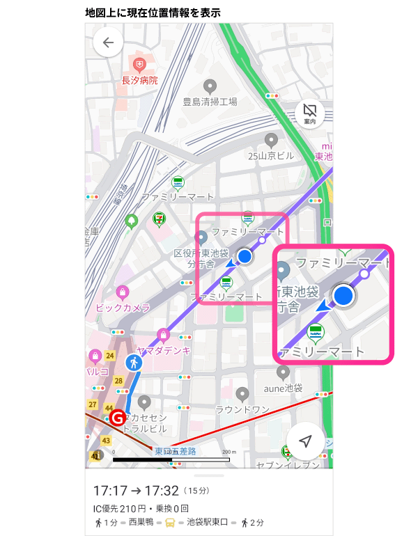 ・今回、一部のバス路線において、ルート検索の地図上に通過するバス停の位置が表示されます。また、ご自身のGPSをオンにすると、位置情報が取得され、これによりユーザーは、乗車バスがどのあたりを走行しているかを確認でき、あとどのくらいで降車バス停に到着するのかを地図上で確認できます。