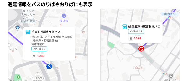 ・ルート詳細画面の地図上でバスのりば、おりばにも遅延情報が反映され表示されます。